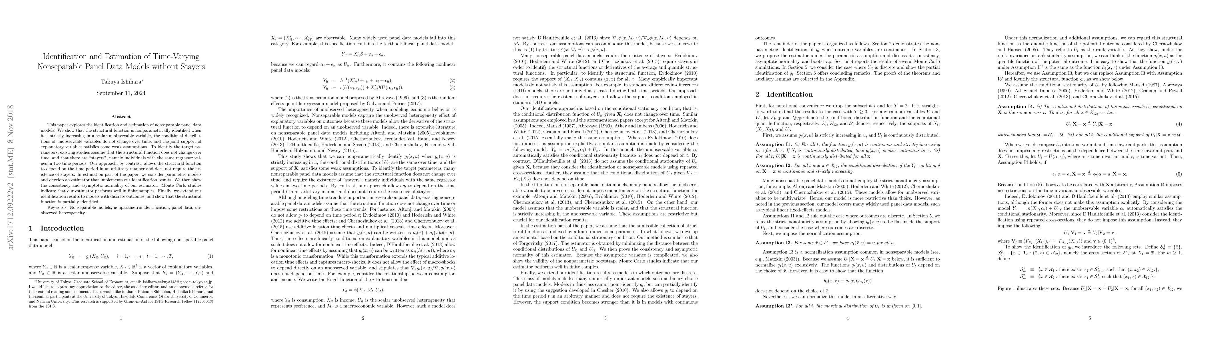 This paper identifies and estimates nonseparable panel data models without requiring "stayers," showing that the structural function is nonparametrically identified under certain conditions. It proposes a parametric estimator that is consistent and asymptotically normal, and demonstrates its effectiveness through Monte Carlo studies.