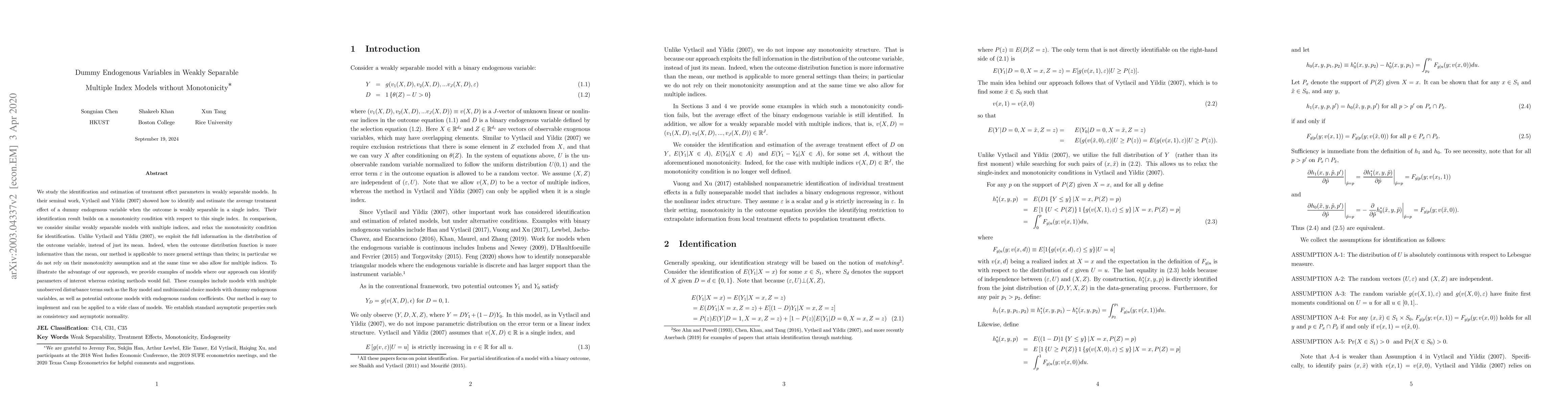 We study the identification and estimation of treatment effect parameters in weakly separable models. In their seminal work, Vytlacil and Yildiz (2007) showed how to identify and estimate the average treatment effect of a dummy endogenous variable when the outcome is weakly separable in a single index. Their identification result builds on a monotonicity condition with respect to this single index. In comparison, we consider similar weakly separable models with multiple indices, and relax the monotonicity condition for identification. Unlike Vytlacil and Yildiz (2007), we exploit the full information in the distribution of the outcome variable, instead of just its mean. Indeed, when the outcome distribution function is more informative than the mean, our method is applicable to more general settings than theirs; in particular we do not rely on their monotonicity assumption and at the same time we also allow for multiple indices. To illustrate the advantage of our approach, we provide examples of models where our approach can identify parameters of interest whereas existing methods would fail. These examples include models with multiple unobserved disturbance terms such as the Roy model and multinomial choice models with dummy endogenous variables, as well as potential outcome models with endogenous random coefficients. Our method is easy to implement and can be applied to a wide class of models. We establish standard asymptotic properties such as consistency and asymptotic normality.
