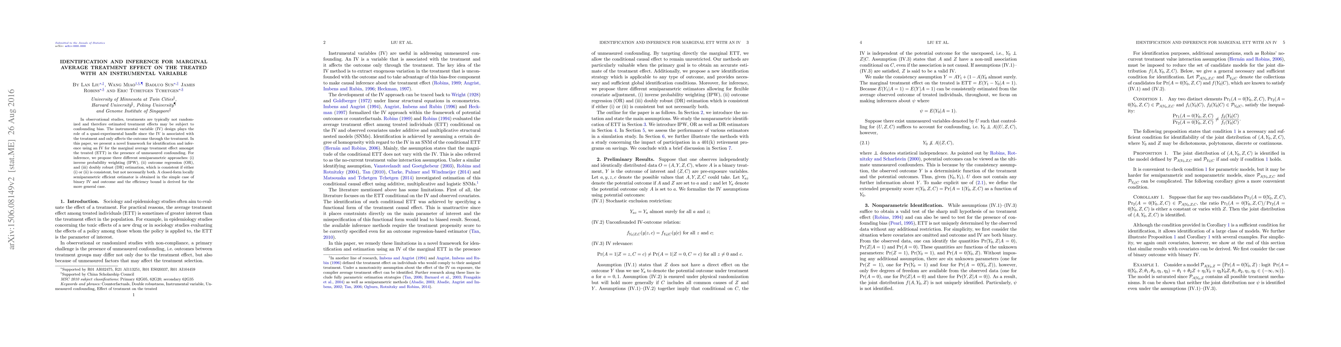 This paper introduces a framework for identifying and inferring the marginal average treatment effect on the treated using an instrumental variable in observational studies. It proposes three semiparametric approaches for inference: inverse probability weighting, outcome regression, and doubly robust estimation, with a focus on addressing unmeasured confounding.