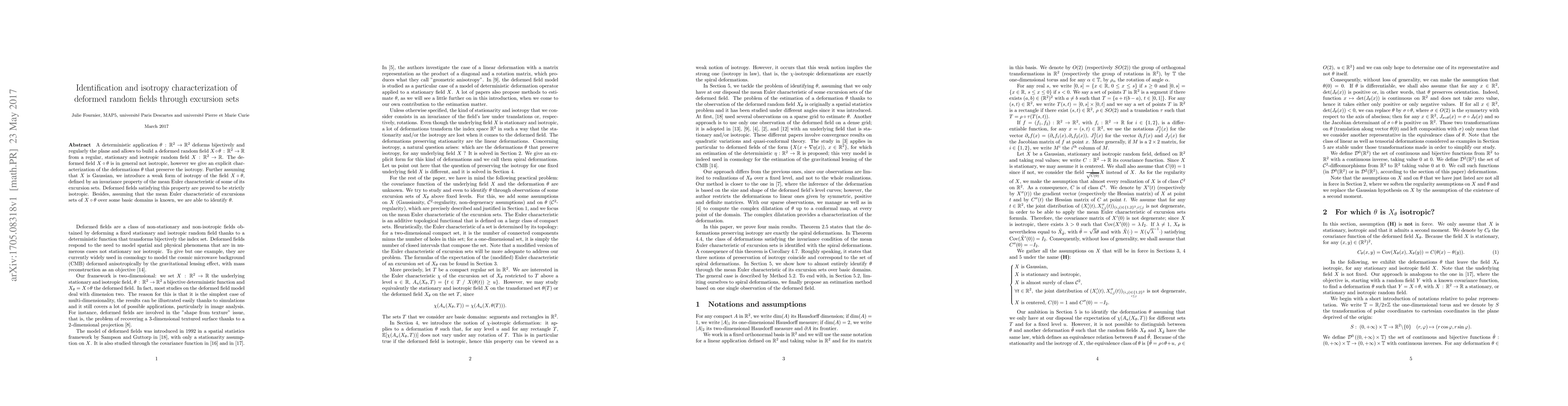 A deterministic application $\theta\,:\,\mathbb{R}^2\rightarrow\mathbb{R}^2$ deforms bijectively and regularly the plane and allows to build a deformed random field $X\circ\theta\,:\,\mathbb{R}^2\rightarrow\mathbb{R}$ from a regular, stationary and isotropic random field $X\,:\,\mathbb{R}^2\rightarrow\mathbb{R}$. The deformed field $X\circ\theta$ is in general not isotropic, however we give an explicit characterization of the deformations $\theta$ that preserve the isotropy. Further assuming that $X$ is Gaussian, we introduce a weak form of isotropy of the field $X\circ\theta$, defined by an invariance property of the mean Euler characteristic of some of its excursion sets. Deformed fields satisfying this property are proved to be strictly isotropic. Besides, assuming that the mean Euler characteristic of excursions sets of $X\circ\theta$ over some basic domains is known, we are able to identify $\theta$.