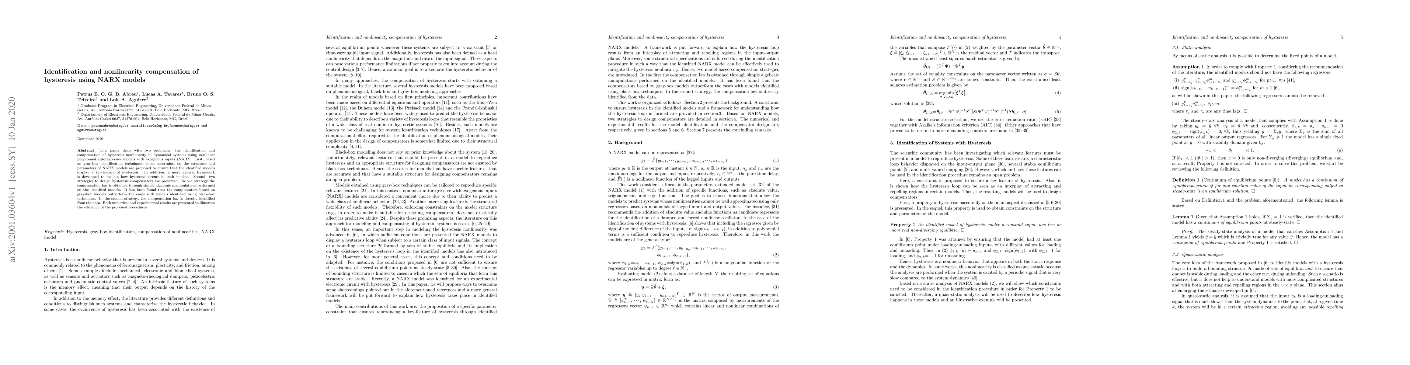 This paper deals with two problems: the identification and compensation of hysteresis nonlinearity in dynamical systems using nonlinear polynomial autoregressive models with exogenous inputs (NARX). First, based on gray-box identification techniques, some constraints on the structure and parameters of NARX models are proposed to ensure that the identified models display a key-feature of hysteresis. In addition, a more general framework is developed to explain how hysteresis occurs in such models. Second, two strategies to design hysteresis compensators are presented. In one strategy the compensation law is obtained through simple algebraic manipulations performed on the identified models. It has been found that the compensators based on gray-box models outperform the cases with models identified using black-box techniques. In the second strategy, the compensation law is directly identified from the data. Both numerical and experimental results are presented to illustrate the efficiency of the proposed procedures.