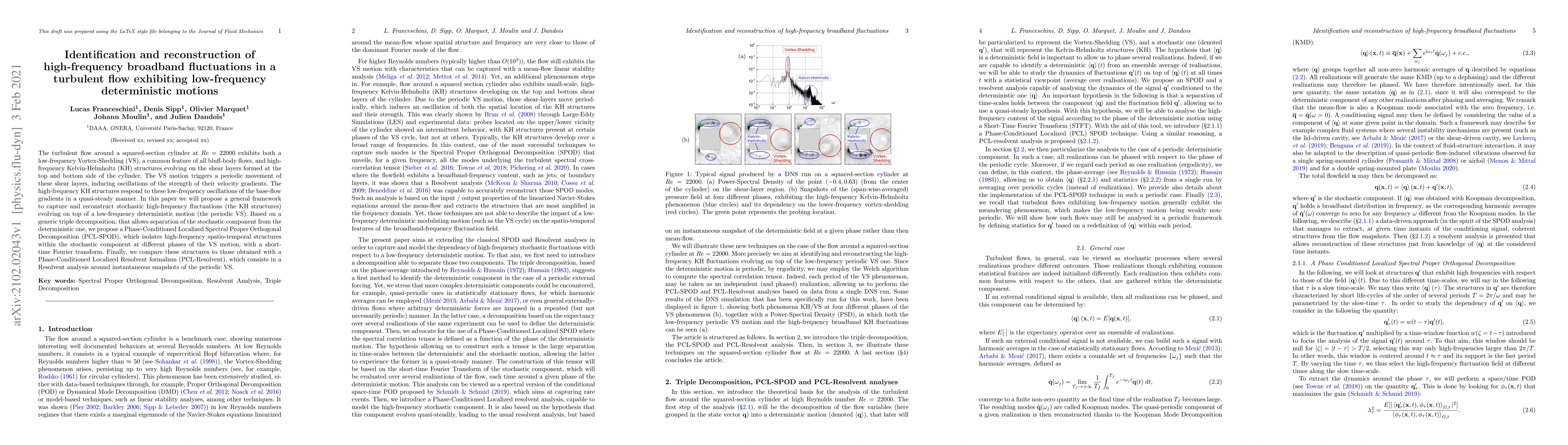 The turbulent flow around a squared-section cylinder at $Re=22000$ exhibits both a low-frequency Vortex-Shedding (VS), a common feature of all bluff-body flows, and high-frequency Kelvin-Helmholtz (KH) structures evolving on the shear layers formed at the top and bottom side of the cylinder. The VS motion triggers a periodic movement of these shear layers, inducing oscillations of the strength of their velocity gradients. The high-frequency KH structures respond to these low-frequency oscillations of the base-flow gradients in a quasi-steady manner. In this paper we will propose a general framework to capture and reconstruct stochastic high-frequency fluctuations (the KH structures) evolving on top of a low-frequency deterministic motion (the periodic VS). Based on a generic triple decomposition, that allows separation of the stochastic component from the deterministic one, we propose a Phase-Conditioned Localized Spectral Proper Orthogonal Decomposition (PCL-SPOD), which isolates high-frequency spatio-temporal structures within the stochastic component at different phases of the VS motion, with a short-time Fourier transform. Finally, we compare these structures to those obtained with a Phase-Conditioned Localized Resolvent formalism (PCL-Resolvent), which consists in a Resolvent analysis around instantaneous snapshots of the periodic VS.