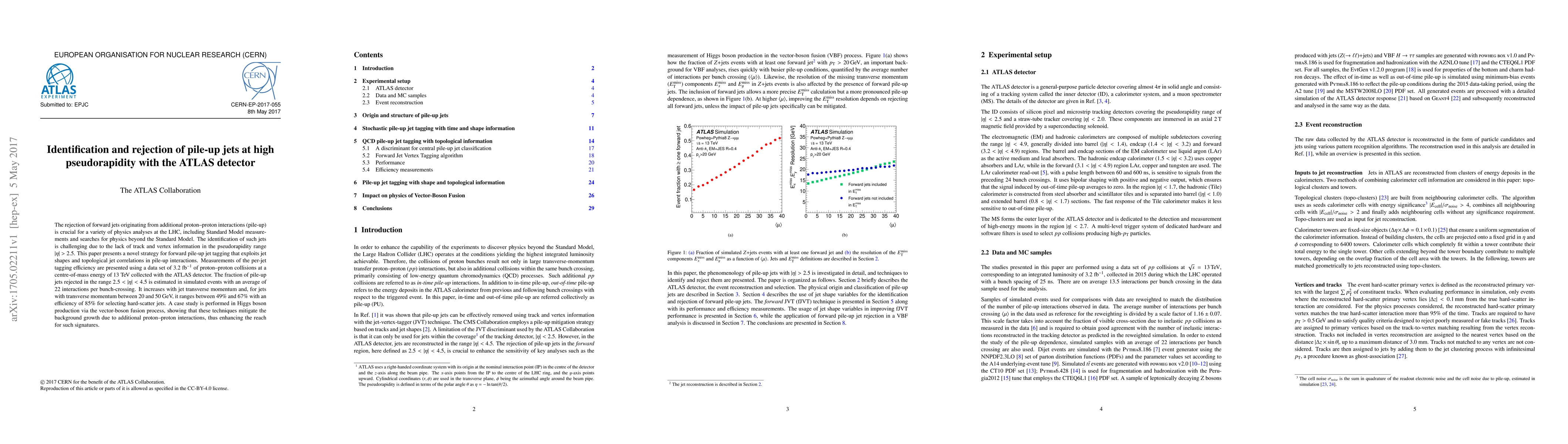 This paper introduces a novel method for identifying and rejecting pile-up jets at high pseudorapidity using the ATLAS detector, focusing on jet shapes and topological correlations. The strategy shows a rejection fraction of 49%-67% for jets with transverse momentum between 20-50 GeV, enhancing the analysis of Higgs boson production via vector-boson fusion by mitigating pile-up background.