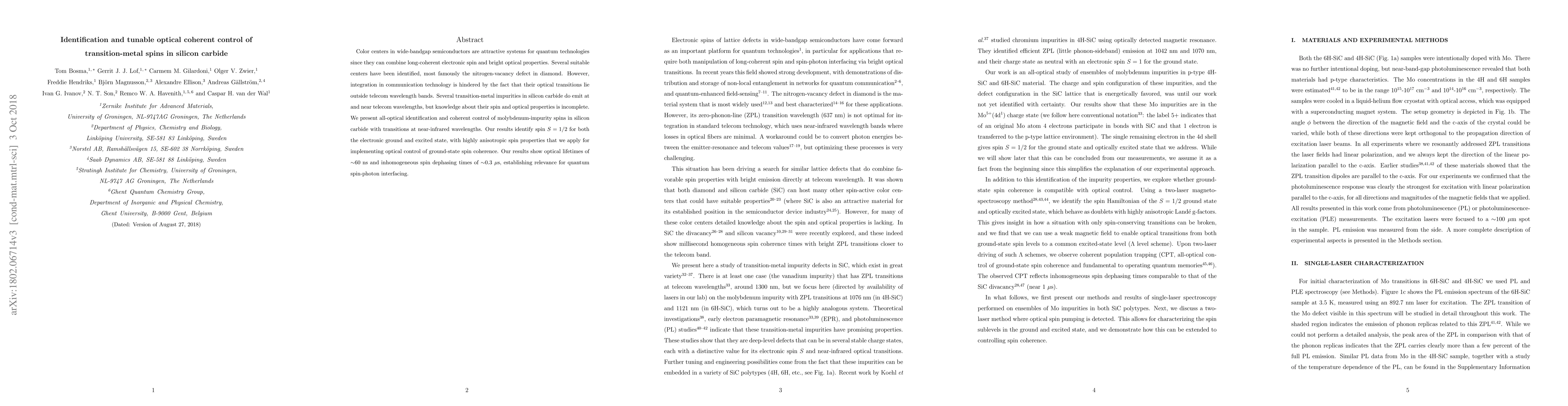 This paper identifies and coherently controls molybdenum-impurity spins in silicon carbide, demonstrating their potential for quantum technologies due to near-infrared transitions at telecom wavelengths and anisotropic spin properties for optical coherence. The study reports optical lifetimes of ~60 ns and spin dephasing times of ~0.3 μs, indicating suitability for quantum spin-photon interfacing.