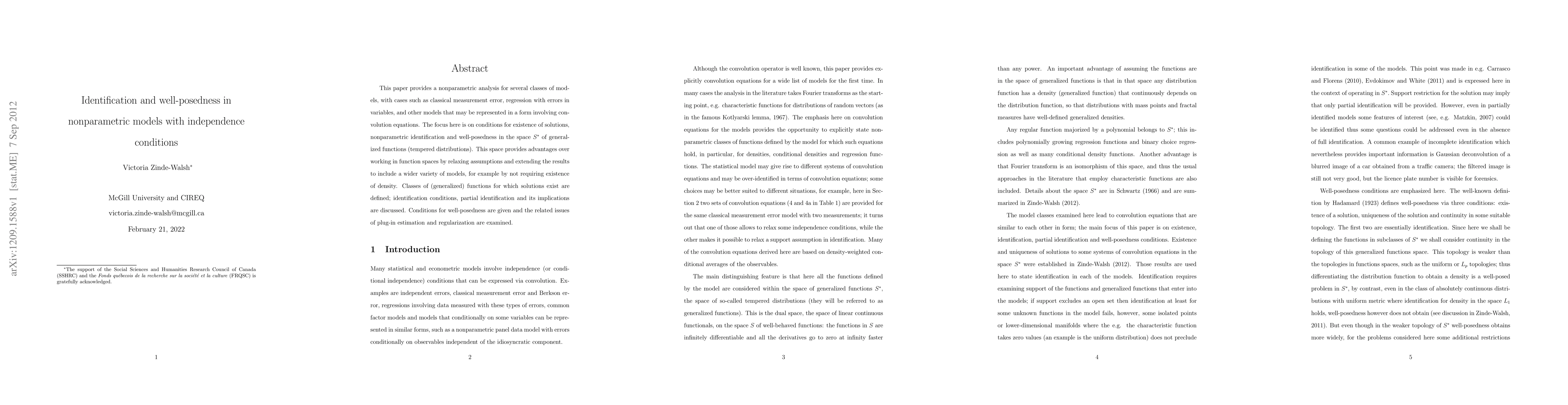 This paper analyzes nonparametric models under independence conditions, focusing on the existence of solutions and well-posedness in the space of tempered distributions. It discusses identification conditions, partial identification, and plug-in estimation, extending results to a wider range of models without requiring density existence.