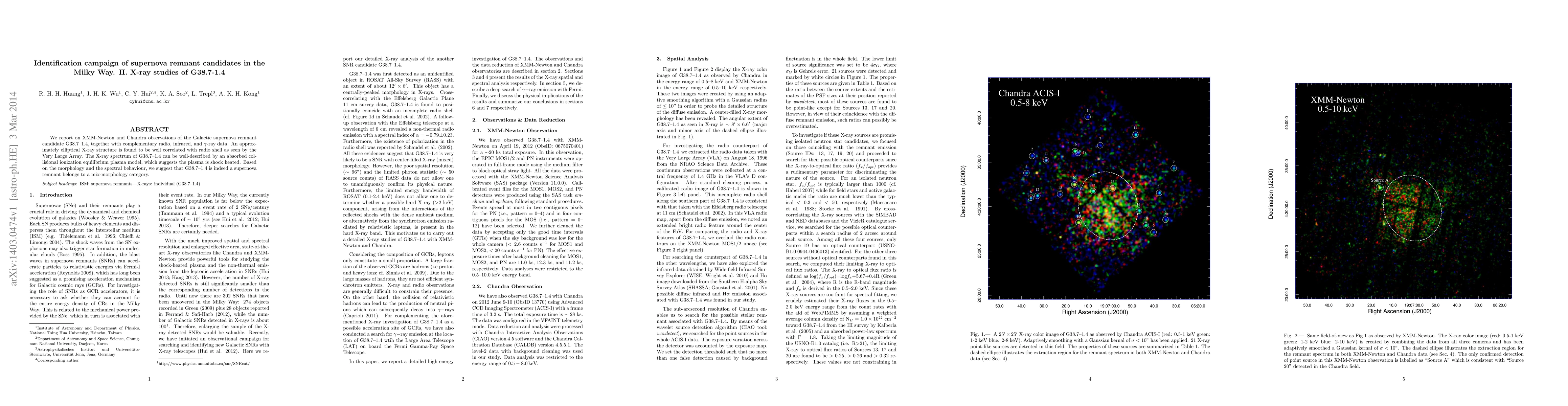 We report on XMM-Newton and Chandra observations of the Galactic supernova remnant candidate G38.7-1.4, together with complementary radio, infrared, and gamma-ray data. An approximately elliptical X-ray structure is found to be well correlated with radio shell as seen by the Very Large Array. The X-ray spectrum of G38.7-1.4 can be well-described by an absorbed collisional ionization equilibrium plasma model, which suggests the plasma is shock heated. Based on the morphology and the spectral behaviour, we suggest that G38.7-1.4 is indeed a supernova remnant belongs to a mix-morphology category.