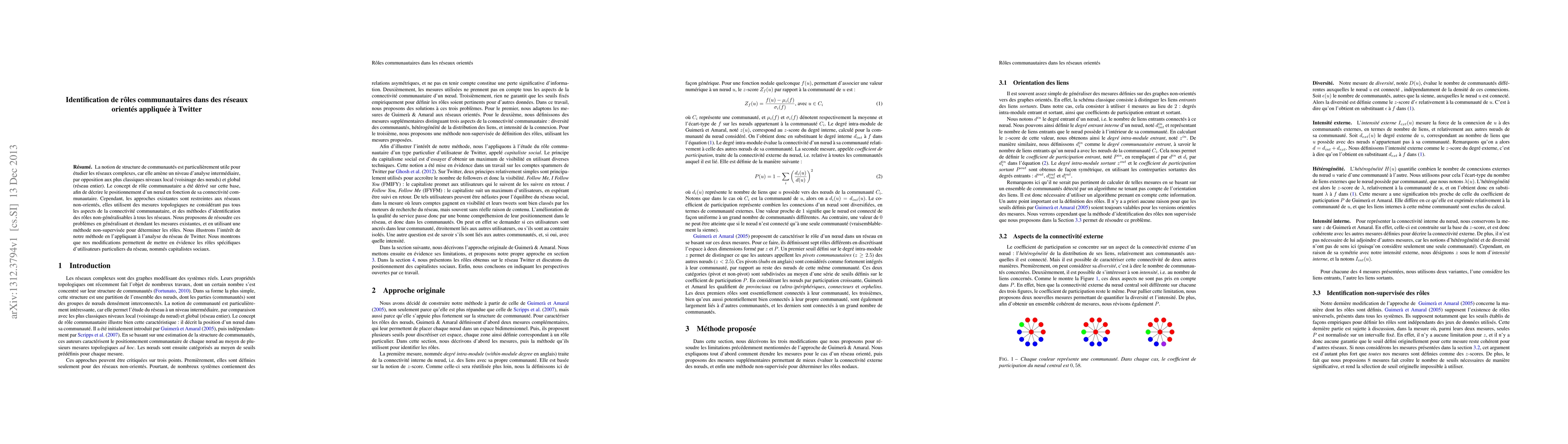 The notion of community structure is particularly useful when analyzing complex networks, because it provides an intermediate level, compared to the more classic global (whole network) and local (node neighborhood) approaches. The concept of community role of a node was derived from this base, in order to describe the position of a node in a network depending on its connectivity at the community level. However, the existing approaches are restricted to undirected networks, use topological measures which do not consider all aspects of community-related connectivity, and their role identification methods are not generalizable to all networks. We tackle these limitations by generalizing and extending the measures, and using an unsupervised approach to determine the roles. We then illustrate the applicability of our method by analyzing a Twitter network.We show how our modifications allow discovering the fact some particular users called social capitalists occupy very specific roles in this system. --- La notion de structure de communaut\'es est particuli\`erement utile pour \'etudier les r\'eseaux complexes, car elle am\`ene un niveau d'analyse interm\'ediaire, par opposition aux plus classiques niveaux local (voisinage des noeuds) et global (r\'eseau entier). Le concept de r\^ole communautaire permet de d\'ecrire le positionnement d'un noeud en fonction de sa connectivit\'e communautaire. Cependant, les approches existantes sont restreintes aux r\'eseaux non-orient\'es, utilisent des mesures topologiques ne consid\'erant pas tous les aspects de la connectivit\'e communautaire, et des m\'ethodes d'identification des r\^oles non-g\'en\'eralisables \`a tous les r\'eseaux. Nous proposons de r\'esoudre ces probl\`emes en g\'en\'eralisant les mesures existantes, et en utilisant une m\'ethode non-supervis\'ee pour d\'eterminer les r\^oles. Nous illustrons l'int\'er\^et de notre m\'ethode en l'appliquant au r\'eseau de Twitter. Nous montrons que nos modifications mettent en \'evidence les r\^oles sp\'ecifiques d'utilisateurs particuliers du r\'eseau, nomm\'es capitalistes sociaux.
