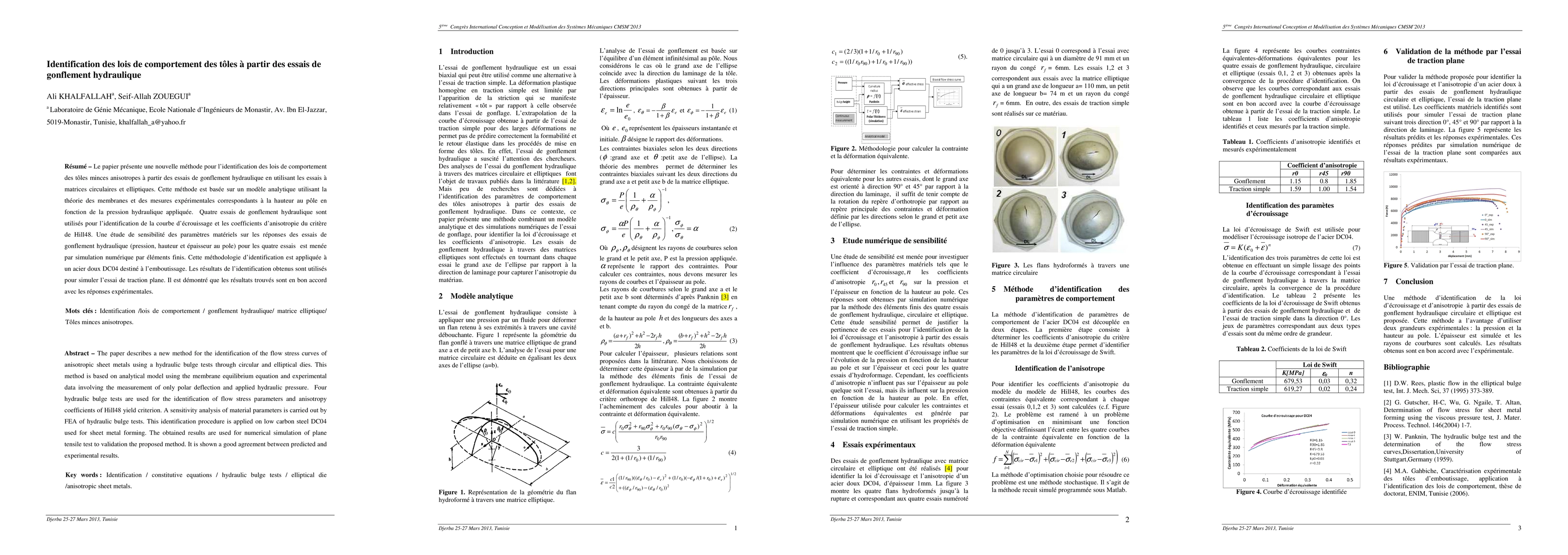 The paper proposes a novel method for identifying flow stress curves and anisotropy coefficients of anisotropic sheet metals using hydraulic bulge tests through circular and elliptical dies, validated with low carbon steel DC04, showing good agreement between predicted and experimental tensile test results.