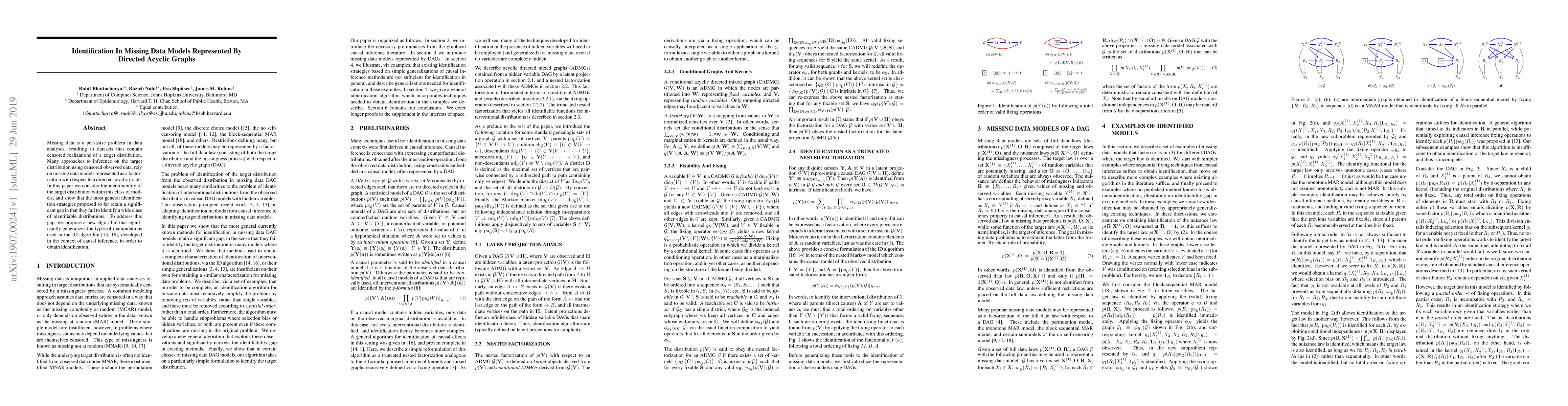 Missing data is a pervasive problem in data analyses, resulting in datasets that contain censored realizations of a target distribution. Many approaches to inference on the target distribution using censored observed data, rely on missing data models represented as a factorization with respect to a directed acyclic graph. In this paper we consider the identifiability of the target distribution within this class of models, and show that the most general identification strategies proposed so far retain a significant gap in that they fail to identify a wide class of identifiable distributions. To address this gap, we propose a new algorithm that significantly generalizes the types of manipulations used in the ID algorithm, developed in the context of causal inference, in order to obtain identification.