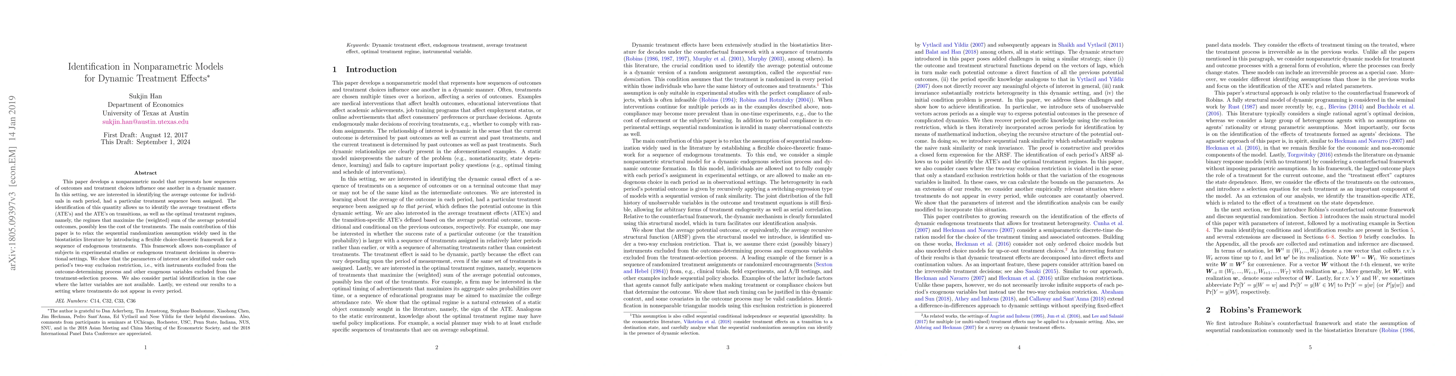 This paper proposes a nonparametric model for identifying dynamic treatment effects without sequential randomization, focusing on average outcomes and treatment regimes. It identifies parameters under two-way exclusion restrictions and extends results to scenarios where treatments are not present in every period.