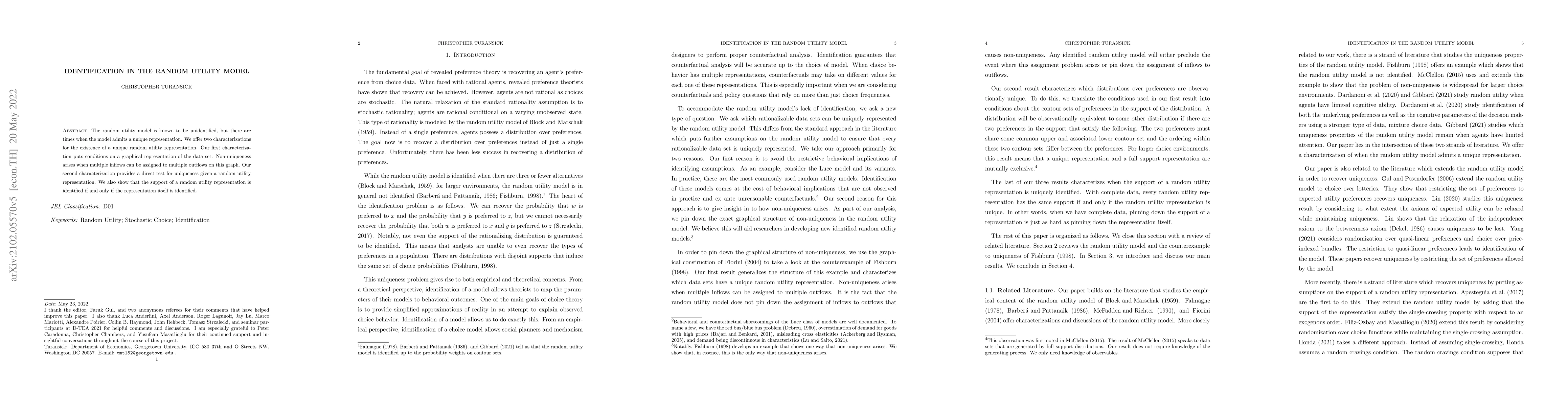 The random utility model is known to be unidentified, but there are times when the model admits a unique representation. We offer two characterizations for the existence of a unique random utility representation. Our first characterization puts conditions on a graphical representation of the data set. Non-uniqueness arises when multiple inflows can be assigned to multiple outflows on this graph. Our second characterization provides a direct test for uniqueness given a random utility representation. We also show that the support of a random utility representation is identified if and only if the representation itself is identified.