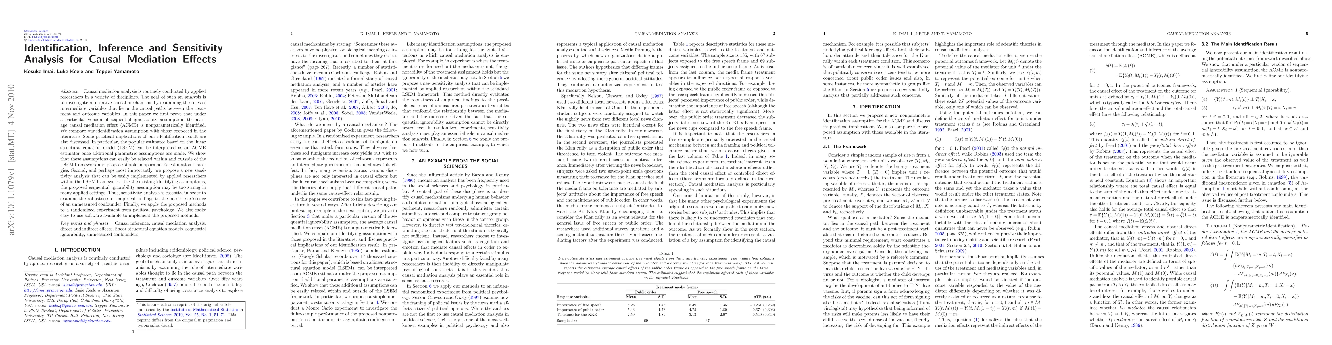 Causal mediation analysis is routinely conducted by applied researchers in a variety of disciplines. The goal of such an analysis is to investigate alternative causal mechanisms by examining the roles of intermediate variables that lie in the causal paths between the treatment and outcome variables. In this paper we first prove that under a particular version of sequential ignorability assumption, the average causal mediation effect (ACME) is nonparametrically identified. We compare our identification assumption with those proposed in the literature. Some practical implications of our identification result are also discussed. In particular, the popular estimator based on the linear structural equation model (LSEM) can be interpreted as an ACME estimator once additional parametric assumptions are made. We show that these assumptions can easily be relaxed within and outside of the LSEM framework and propose simple nonparametric estimation strategies. Second, and perhaps most importantly, we propose a new sensitivity analysis that can be easily implemented by applied researchers within the LSEM framework. Like the existing identifying assumptions, the proposed sequential ignorability assumption may be too strong in many applied settings. Thus, sensitivity analysis is essential in order to examine the robustness of empirical findings to the possible existence of an unmeasured confounder. Finally, we apply the proposed methods to a randomized experiment from political psychology. We also make easy-to-use software available to implement the proposed methods.