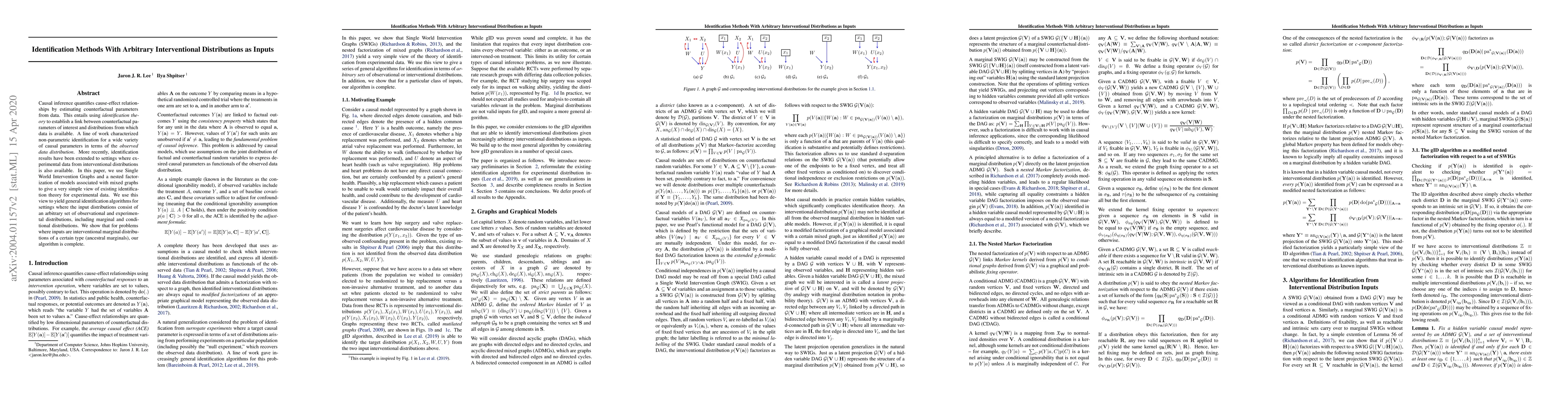 This paper develops identification algorithms for causal inference using both observational and interventional data distributions. It leverages Single World Intervention Graphs and mixed graph factorization to create a simple framework for existing identification theory, providing a general approach applicable to various input distributions.