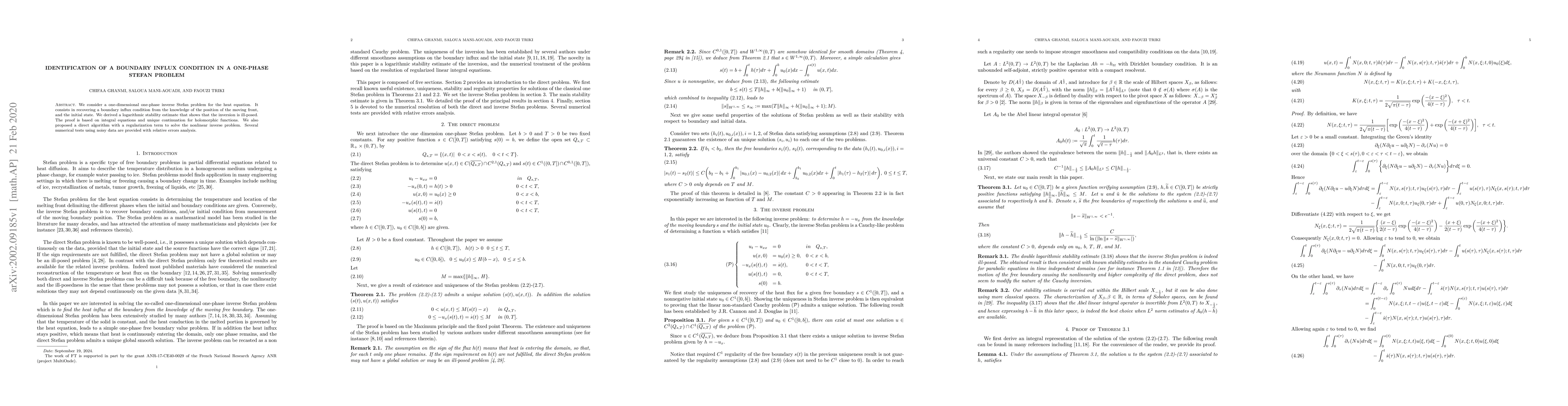 This paper addresses a one-dimensional inverse Stefan problem to determine a boundary influx condition from the position of a moving front and initial state. It demonstrates the ill-posedness of the inversion via a logarithmic stability estimate and proposes a regularization-based algorithm for solving the problem, supported by numerical tests and error analysis.