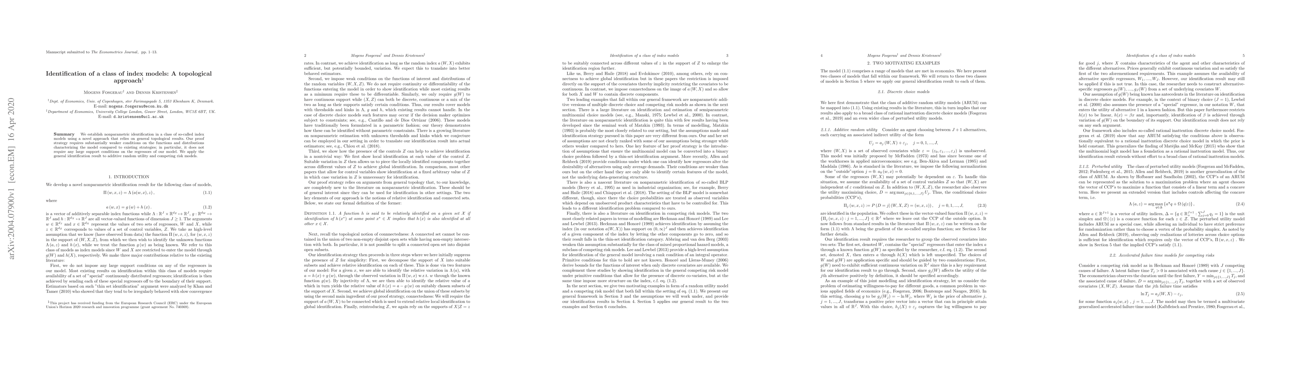 We establish nonparametric identification in a class of so-called index models using a novel approach that relies on general topological results. Our proof strategy requires substantially weaker conditions on the functions and distributions characterizing the model compared to existing strategies; in particular, it does not require any large support conditions on the regressors of our model. We apply the general identification result to additive random utility and competing risk models.