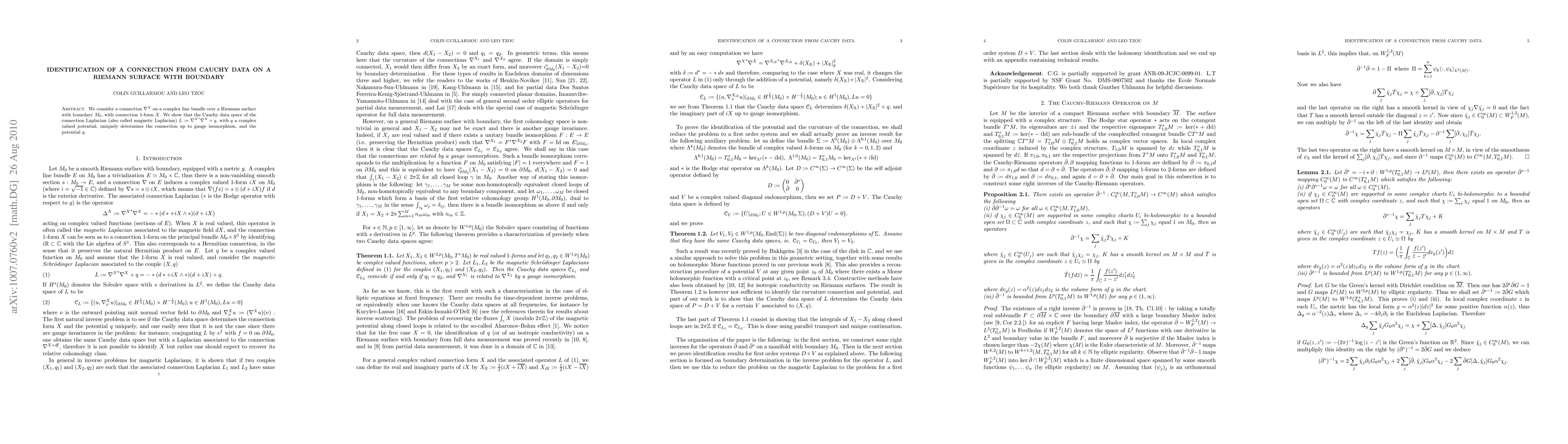 Summary: The paper establishes that the Cauchy data space of the connection Laplacian on a complex line bundle over a Riemann surface with boundary uniquely determines the connection and the associated potential up to gauge isomorphism. This identification highlights the intrinsic relationship between the boundary data and the connection properties.