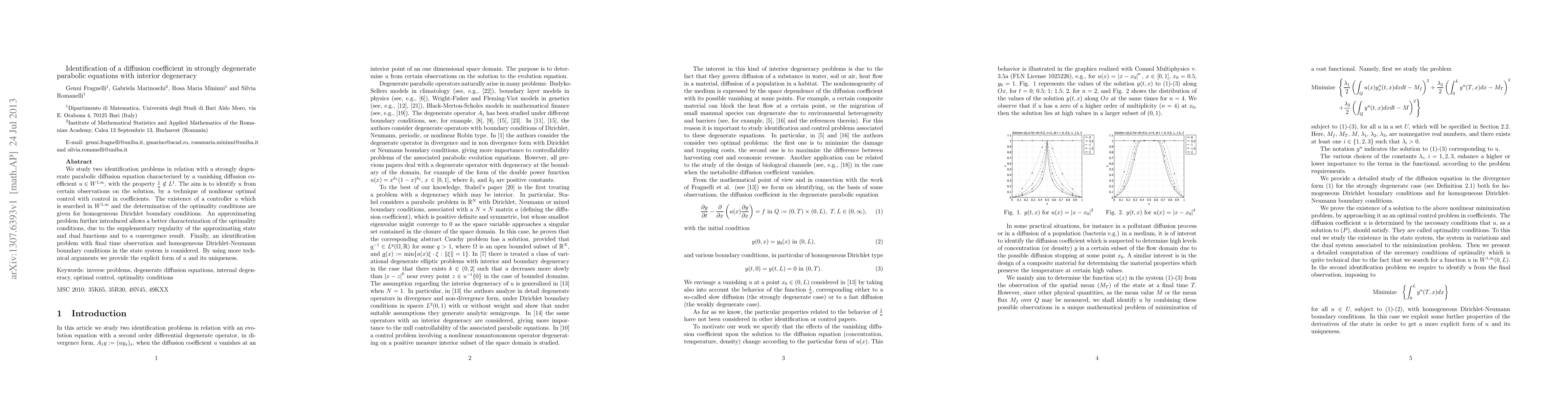 We study two identification problems in relation with a strongly degenerate parabolic diffusion equation characterized by a vanishing diffusion coefficient $u\in W^{1,\infty},$ with the property $\frac{1}{u}\notin L^{1}. $ The aim is to identify $u$ from certain observations on the solution, by a technique of nonlinear optimal control with control in coefficients. The existence of a controller $u$ which is searched in $% W^{1,\infty}$ and the determination of the optimality conditions are given for homogeneous Dirichlet boundary conditions. An approximating problem further introduced allows a better characterization of the optimality conditions, due to the supplementary regularity of the approximating state and dual functions and to a convergence result. Finally, an identification problem with final time observation and homogeneous Dirichlet-Neumann boundary conditions in the state system is considered. By using more technical arguments we provide the explicit form of $u$ and its uniqueness.