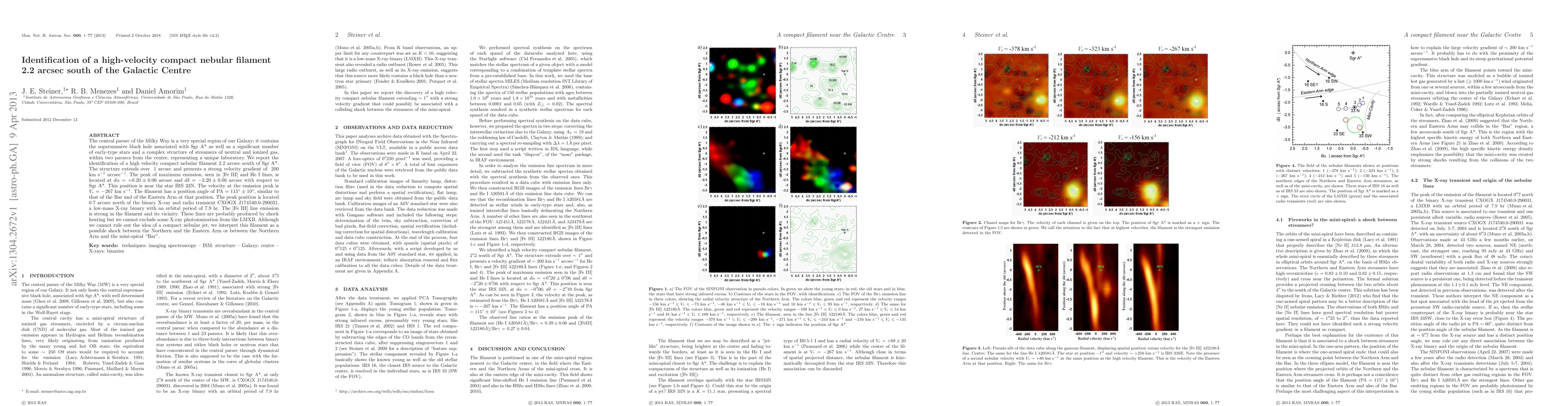 The central parsec of the Milky Way is a very special region of our Galaxy; it contains the supermassive black hole associated with Sgr A* as well as a significant number of early-type stars and a complex structure of streamers of neutral and ionized gas, within two parsecs from the centre, representing a unique laboratory. We report the identification of a high velocity compact nebular filament 2.2 arcsec south of Sgr A*. The structure extends over ~1 arcsec and presents a strong velocity gradient of ~200 km s^{-1} arcsec^{-1}. The peak of maximum emission, seen in [Fe III] and He I lines, is located at d{\alpha} = +0.20 +/- 0.06 arcsec and d{\delta} = -2.20 +/- 0.06 arcsec with respect to Sgr A*. This position is near the star IRS 33N. The velocity at the emission peak is Vr = -267 km s^{-1}. The filament has a position angle of PA = 115{\degr} +/- 10{\degr}, similar to that of the Bar and of the Eastern Arm at that position. The peak position is located 0.7 arcsec north of the binary X-ray and radio transient CXOGX J174540.0-290031, a low-mass X-ray binary with an orbital period of 7.9 hr. The [Fe III] line emission is strong in the filament and its vicinity. These lines are probably produced by shock heating but we cannot exclude some X-ray photoionization from the low-mass X-ray binary. Although we cannot rule out the idea of a compact nebular jet, we interpret this filament as a possible shock between the Northern and the Eastern Arm or between the Northern Arm and the mini-spiral "Bar".