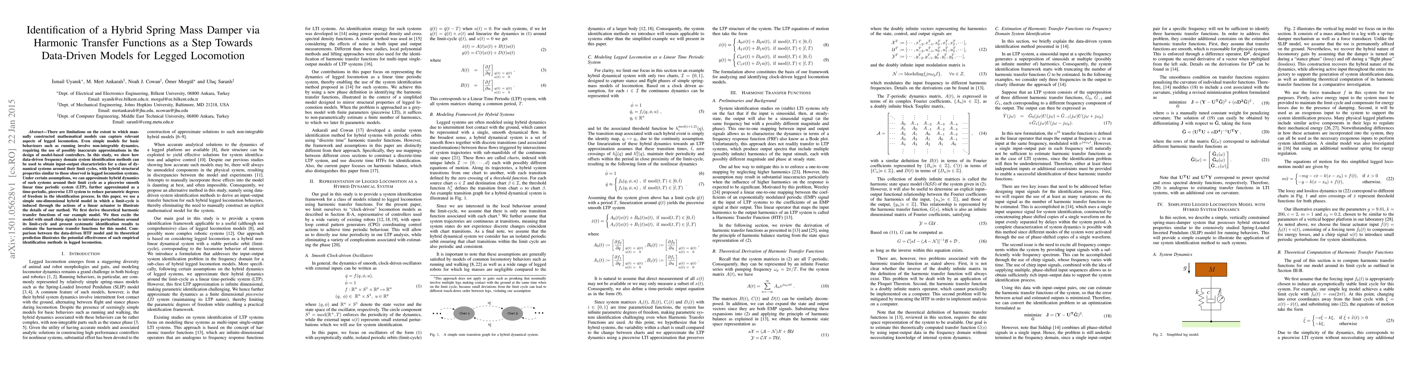 This paper proposes a data-driven frequency domain identification method to model hybrid spring mass damper systems, illustrating the approach with a one-dimensional model. The method aims to capture the dynamics of legged locomotion systems, reducing reliance on potentially inaccurate approximations in traditional mathematical modeling.
