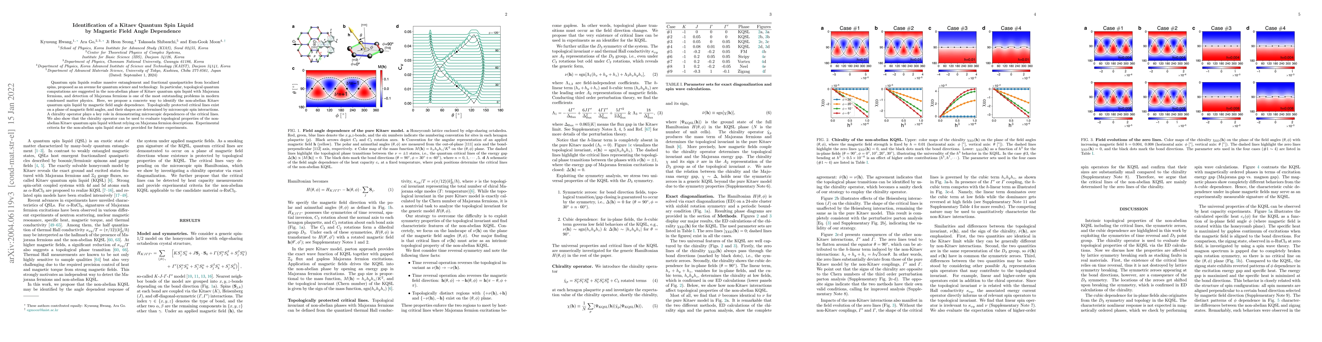 This paper proposes a method to identify a non-abelian Kitaev quantum spin liquid through the magnetic field angle dependence, revealing topologically protected critical lines determined by spin interactions. The chirality operator is used to evaluate topological properties without Majorana fermions, offering experimental criteria for future detection.