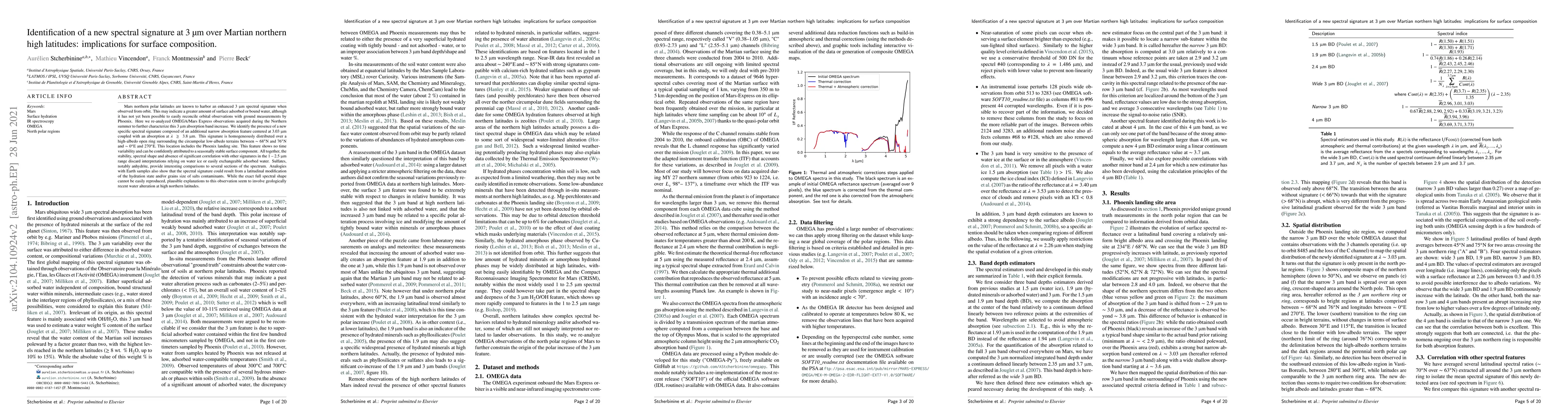 Mars northern polar latitudes are known to harbor an enhanced 3 ${\mu}$m spectral signature when observed from orbit. This may indicate a greater amount of surface adsorbed or bound water, although it has not yet been possible to easily reconcile orbital observations with ground measurements by Phoenix. Here we re-analyzed OMEGA/Mars Express observations acquired during the Northern summer to further characterize this 3 ${\mu}$m absorption band increase. We identify the presence of a new specific spectral signature composed of an additional narrow absorption feature centered at 3.03 ${\mu}$m coupled with an absorption at ${\lambda}$ ${\geq}$ 3.8 ${\mu}$m. This signature is homogeneously distributed over a high-albedo open ring surrounding the circumpolar low-albedo terrains between ~ 68{\deg}N and 76{\deg}N and ~ 0{\deg}E and 270{\deg}E. This location includes the Phoenix landing site. This feature shows no time variability and can be confidently attributed to a seasonally stable surface component. All together, the stability, spectral shape and absence of significant correlation with other signatures in the 1 $-$ 2.5 ${\mu}$m range discard interpretations relying on water ice or easily exchangeable adsorbed water. Sulfates, notably anhydrite, provide interesting comparisons to several sections of the spectrum. Analogies with Earth samples also show that the spectral signature could result from a latitudinal modification of the hydration state and/or grains size of salts contaminants. While the exact full spectral shape cannot be easily reproduced, plausible explanations to this observation seem to involve geologically recent water alteration at high northern latitudes.