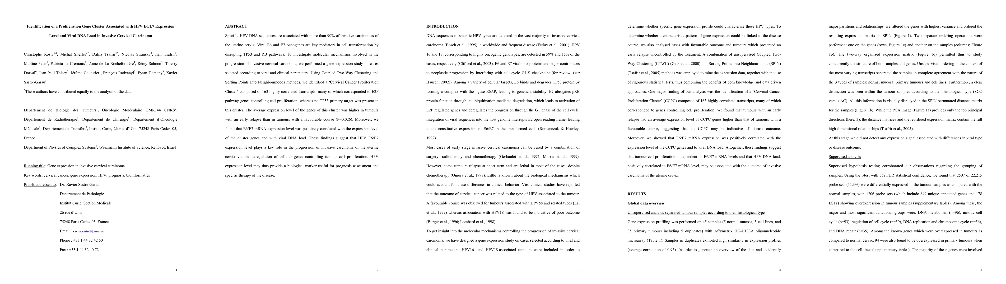 A gene cluster associated with HPV E6/E7 expression levels was identified in invasive cervical carcinoma, suggesting a key role for HPV in tumour progression and potential as a biological marker for prognosis and therapy.