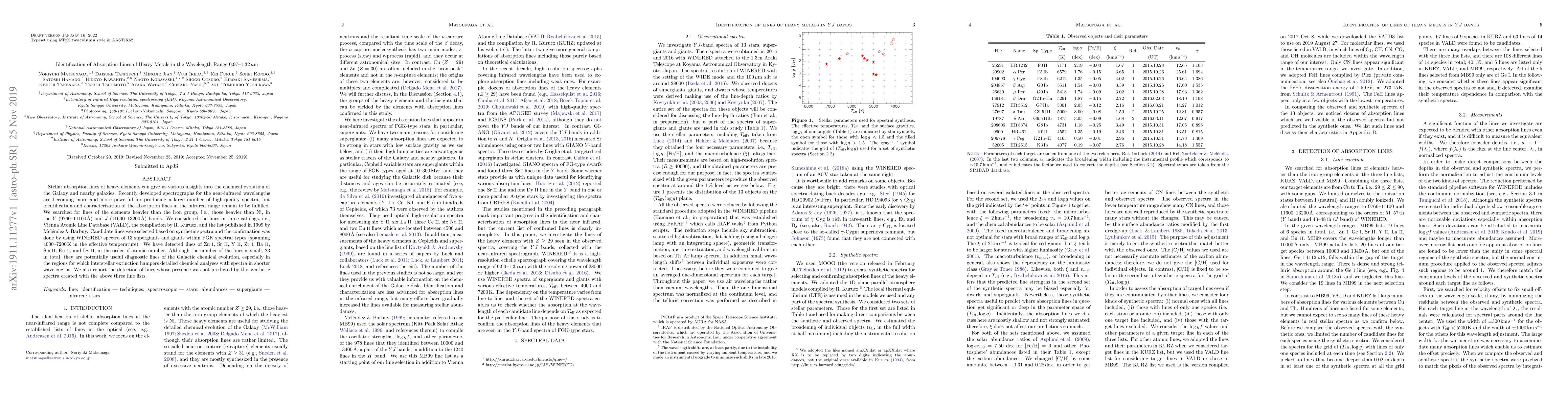 Stellar absorption lines of heavy elements can give us various insights into the chemical evolution of the Galaxy and nearby galaxies. Recently developed spectrographs for the near-infrared wavelengths are becoming more and more powerful for producing a large number of high-quality spectra, but identification and characterization of the absorption lines in the infrared range remain to be fulfilled. We searched for lines of the elements heavier than the iron group, i.e., those heavier than Ni, in the Y (9760--11100 AA) and J (11600--13200 AA) bands. We considered the lines in three catalogs, i.e., Vienna Atomic Line Database (VALD), the compilation by R. Kurucz, and the list published in 1999 by Melendez and Barbuy. Candidate lines were selected based on synthetic spectra and the confirmation was done by using WINERED spectra of 13 supergiants and giants within FGK spectral types (spanning 4000--7200 K in the effective temperature). We have detected lines of Zn I, Sr II, Y II, Zr I, Ba II, Sm II, Eu II, and Dy II, in the order of atomic number. Although the number of the lines is small, 23 in total, they are potentially useful diagnostic lines of the Galactic chemical evolution, especially in the regions for which interstellar extinction hampers detailed chemical analyses with spectra in shorter wavelengths. We also report the detection of lines whose presence was not predicted by the synthetic spectra created with the above three line lists.