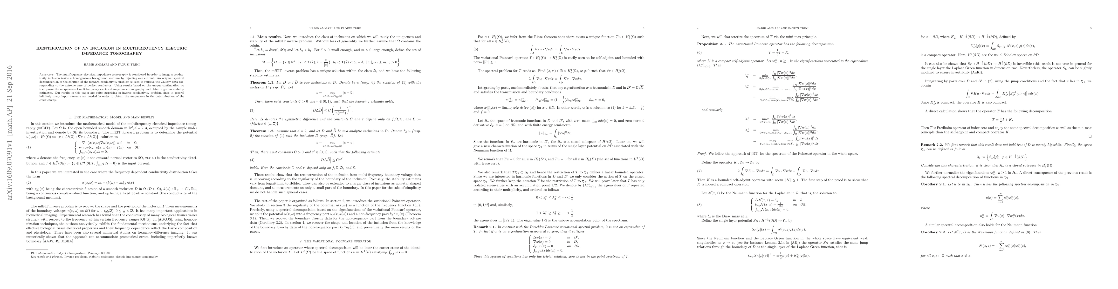 This paper identifies a conductivity inclusion in multifrequency electrical impedance tomography using spectral decomposition to retrieve Cauchy data for perfect conductors. It proves uniqueness and stability in the imaging process, defying the general need for multiple input currents in inverse conductivity problems.