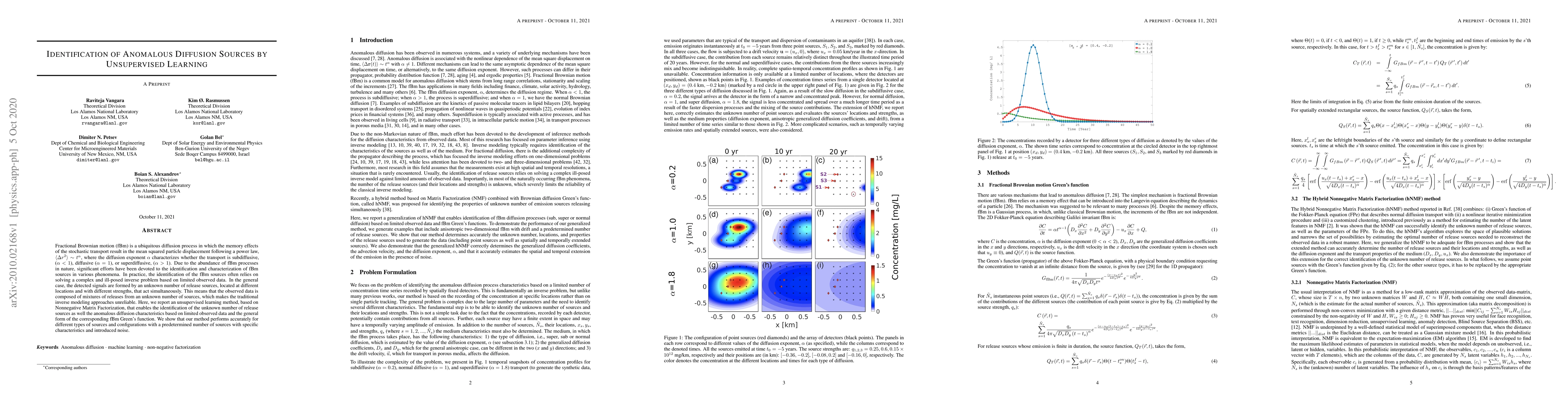 This paper proposes an unsupervised learning method using Nonnegative Matrix Factorization to identify anomalous diffusion sources characterized by fractional Brownian motion, addressing the challenge of detecting an unknown number of simultaneous release sources from limited observed data. The method accurately identifies both the number of sources and their anomalous diffusion characteristics.