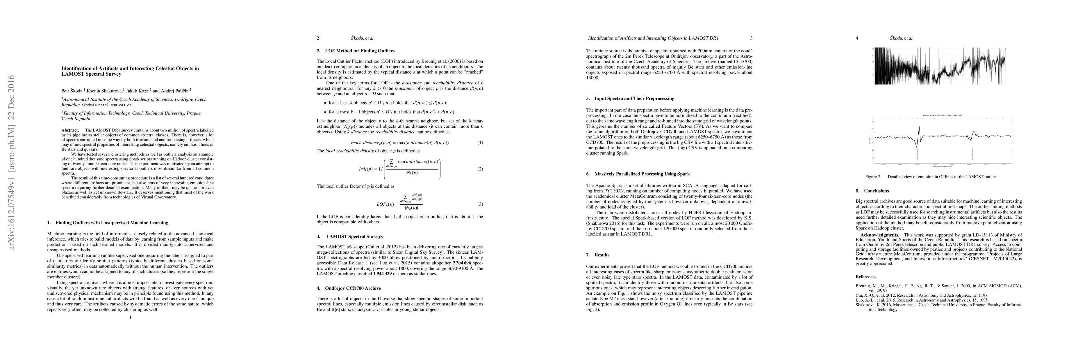 The LAMOST DR1 survey contains about two million of spectra labelled by its pipeline as stellar objects of common spectral classes. There is, however, a lot of spectra corrupted in some way by both instrumental and processing artifacts, which may mimic spectral properties of interesting celestial objects, namely emission lines of Be stars and quasars. We have tested several clustering methods as well as outliers analysis on a sample of one hundred thousand spectra using Spark scripts running on Hadoop cluster consisting of twenty-four sixteen-core nodes. This experiment was motivated by an attempt to find rare objects with interesting spectra as outliers most dissimilar from all common spectra. The result of this time-consuming procedure is a list of several hundred candidates where different artifacts are prominent, but also tens of very interesting emission-line spectra requiring further detailed examination. Many of them may be quasars or even blazars as well as yet unknown Be-stars. It deserves mentioning that most of the work benefitted considerably from technologies of Virtual Observatory.
