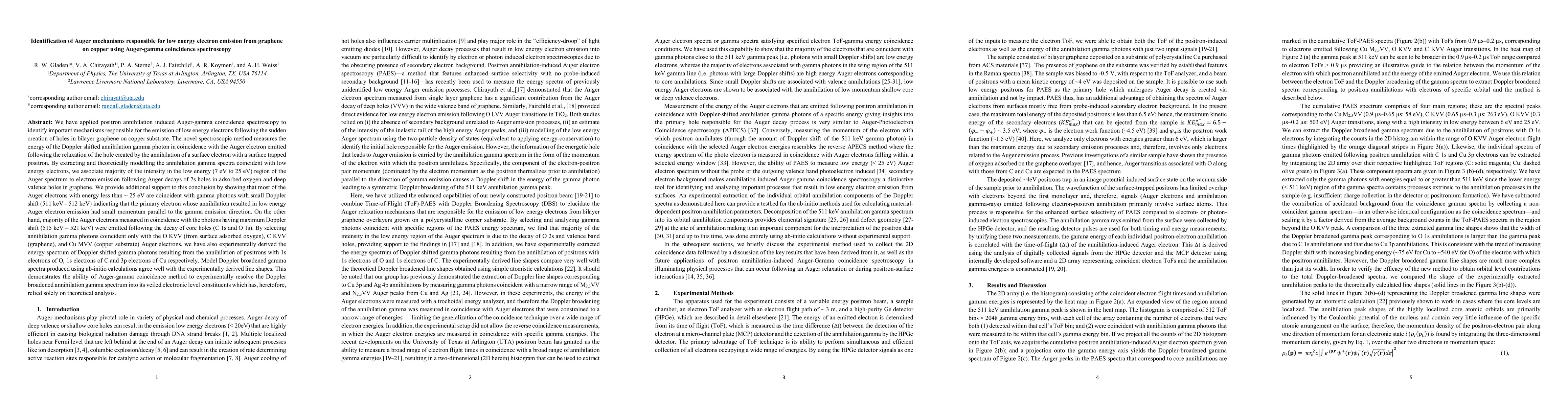 We present a novel method for the analysis of the Doppler broadened spectrum of gamma photons emitted following the annihilation of surface trapped positrons with the electrons of bilayer graphene supported on polycrystalline Cu substrate. The method relies on the measurement of the energy of the Doppler shifted annihilation gamma photons in coincidence with the Auger electrons emitted following the decay of the contemporaneously produced annihilation induced hole. Through the selection of annihilation gamma corresponding to O KVV (adsorbed O), C KVV (graphene), and Cu MVV (substrate) Auger transitions, we have decomposed the annihilation gamma spectrum into spectral components representing annihilation of the positron with 1s electrons of C and O and 3p electrons of Cu. These experimentally derived Doppler broadened gamma line shapes agrees well with the theoretically derived model line shapes demonstrating the ability of our method to resolve a complex Doppler line shapes into its veiled electronic level constituents which has, heretofore, only been achieved through theoretical analysis. We have also demonstrated the reversibility of the analysis method by decomposing the Auger spectra into regions which corresponds to the annihilation gamma photons with a large Doppler shift or to Auger spectra correlated with annihilation gamma photons with a small doppler shift. The reverse analysis provides additional proof that Auger transitions following deep valence annihilations result in the emission of low energy electrons.