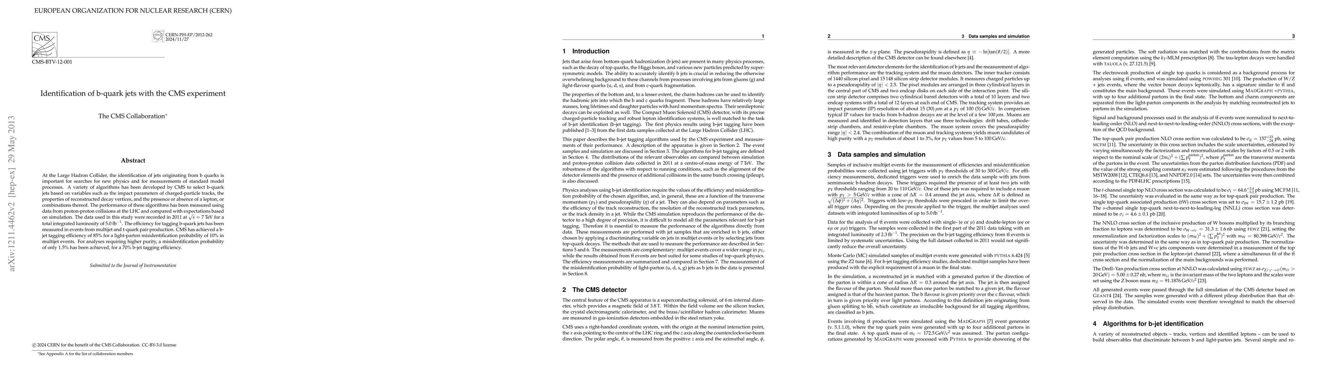 The CMS experiment at the Large Hadron Collider has developed algorithms to identify b-quark jets, crucial for new physics searches and standard model measurements. These algorithms achieve an 85% tagging efficiency with a 10% misidentification rate, and a 70% efficiency with a 1.5% misidentification rate for higher purity requirements.