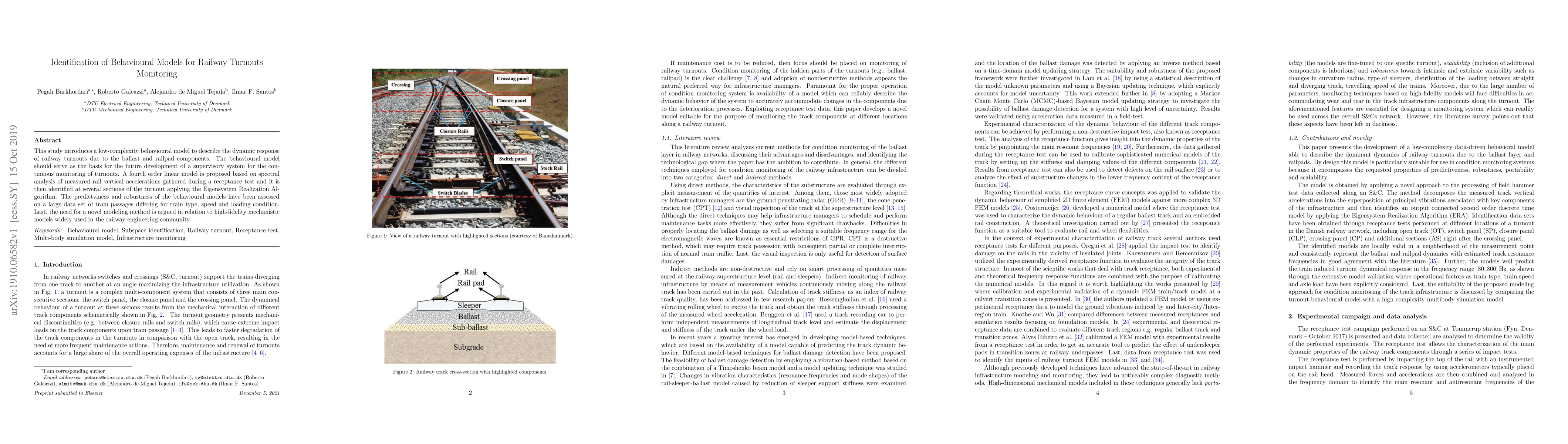 This study introduces a low-complexity behavioural model to describe the dynamic response of railway turnouts due to the ballast and railpad components. The behavioural model should serve as the basis for the future development of a supervisory system for the continuous monitoring of turnouts. A fourth order linear model is proposed based on spectral analysis of measured rail vertical accelerations gathered during a receptance test and it is then identified at several sections of the turnout applying the Eigensystem Realization Algorithm. The predictviness and robustness of the behavioural models have been assessed on a large data set of train passages differing for train type, speed and loading condition. Last, the need for a novel modeling method is argued in relation to high-fidelity mechanistic models widely used in the railway engineering community.