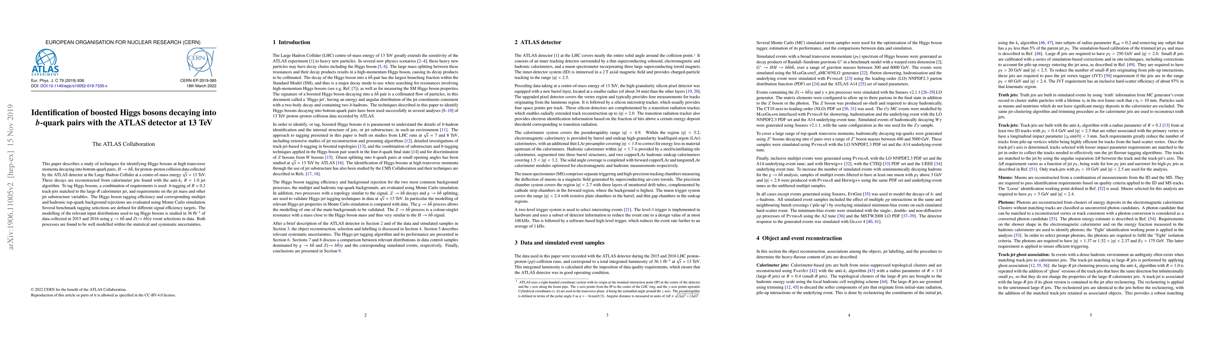 This paper details methods for identifying Higgs bosons decaying into bottom quark pairs in ATLAS detector data at 13 TeV. The study uses a combination of b-tagging, jet mass, and substructure variables, finding that background processes are well-modelled with 36 fb^-1 of 2015-2016 data.