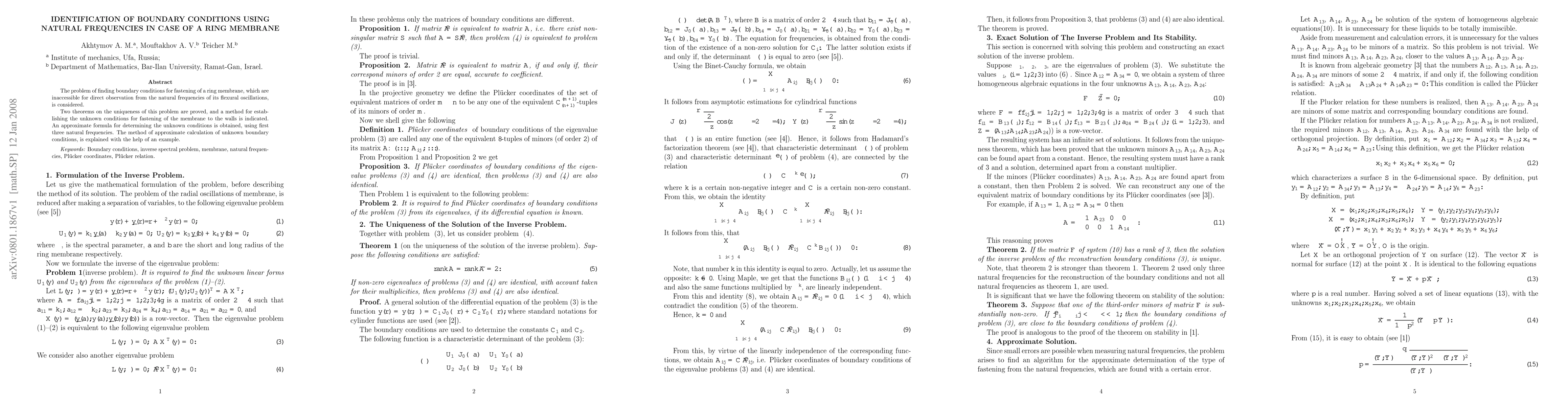The problem of finding boundary conditions for fastening of a ring membrane, which are inaccessible for direct observation from the natural frequencies of its flexural oscillations, is considered. Two theorems on the uniqueness of this problem are proved, and a method for establishing the unknown conditions for fastening of the membrane to the walls is indicated. An approximate formula for determining the unknown conditions is obtained, using first three natural frequencies. The method of approximate calculation of unknown boundary conditions, is explained with the help of an example. Keywords: Boundary conditions, inverse spectral problem, membrane, natural frequencies, Plucker coordinates, Plucker relation.