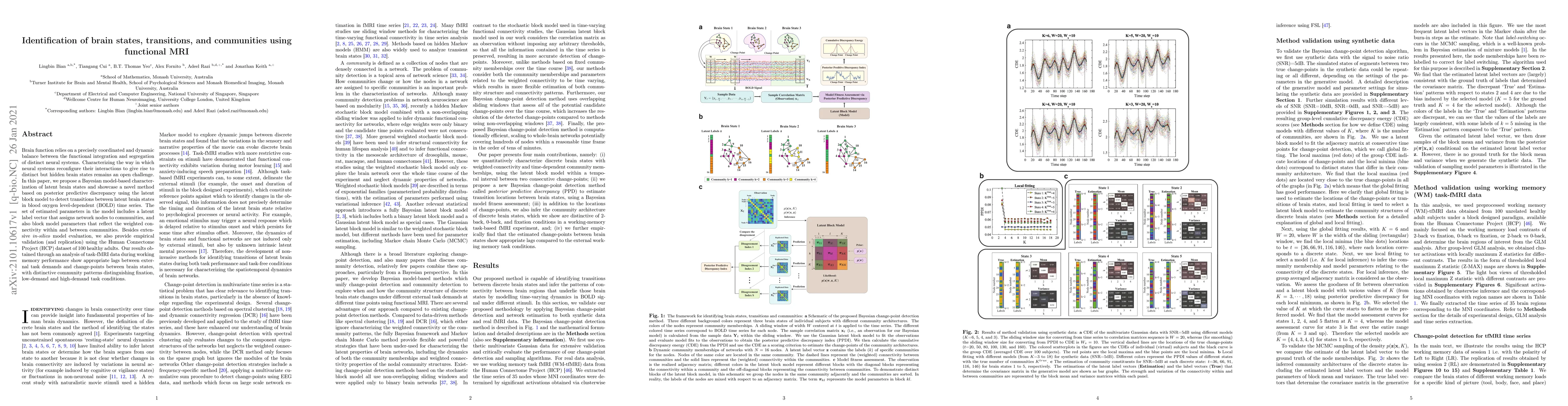 This paper proposes a Bayesian model to identify latent brain states and transitions using functional MRI data, employing a latent block model to detect state changes in BOLD signals. The method is validated with Human Connectome Project data, revealing distinct community patterns during different working memory task conditions.
