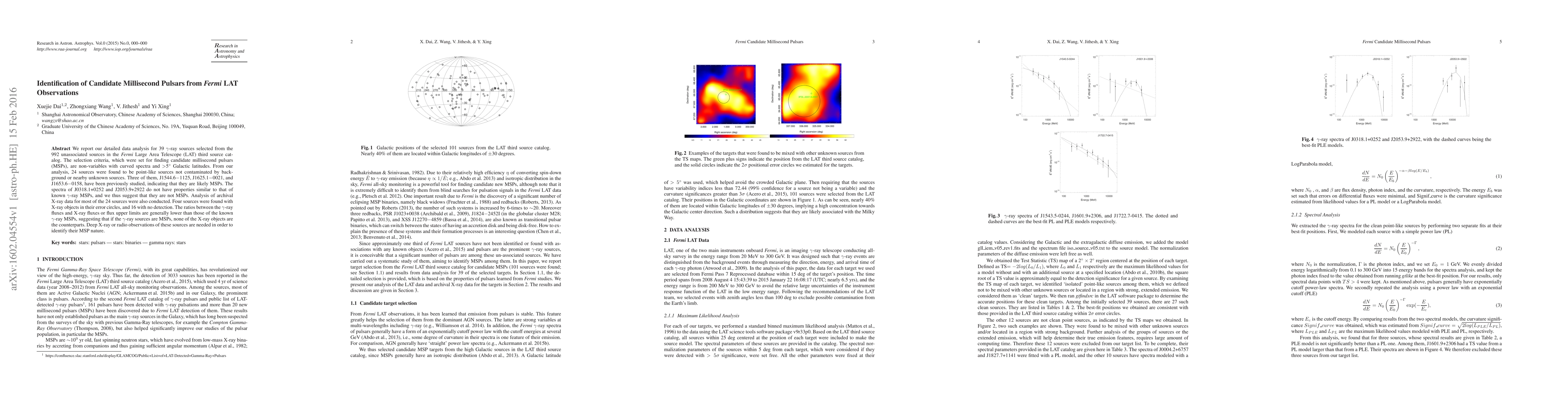 We report our detailed data analysis for 39 $\gamma$-ray sources selected from the 992 unassociated sources in the \textit{Fermi} Large Area Telescope (LAT) third source catalog. The selection criteria, which were set for finding candidate millisecond pulsars (MSPs), are non-variables with curved spectra and $>$5$^{\circ}$ Galactic latitudes. From our analysis, 24 sources were found to be point-like sources not contaminated by background or nearby unknown sources. Three of them, J1544.6$-$1125, J1625.1$-$0021, and J1653.6$-$0158, have been previously studied, indicating that they are likely MSPs. The spectra of J0318.1+0252 and J2053.9+2922 do not have properties similar to that of known $\gamma$-ray MSPs, and we thus suggest that they are not MSPs. Analysis of archival X-ray data for most of the 24 sources were also conducted. Four sources were found with X-ray objects in their error circles, and 16 with no detection. The ratios between the $\gamma$-ray fluxes and X-ray fluxes or flux upper limits are generally lower than those of the known $\gamma$-ray MSPs, suggesting that if the $\gamma$-ray sources are MSPs, none of the X-ray objects are the counterparts. Deep X-ray or radio observations of these sources are needed in order to identify their MSP nature.