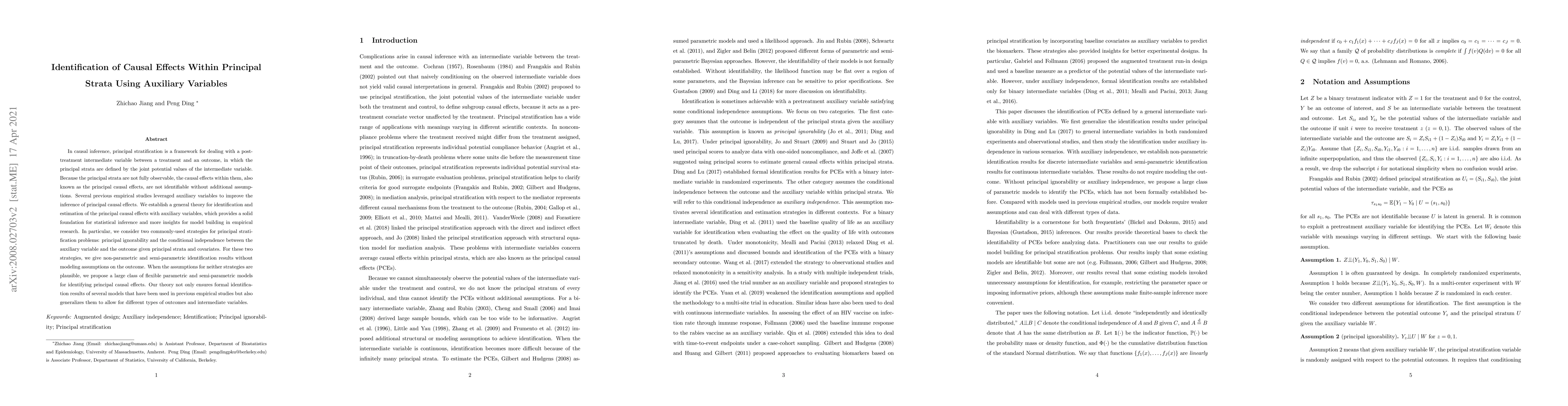 This paper develops a general theory for identifying and estimating principal causal effects using auxiliary variables, addressing the challenge of unobservable principal strata. It proposes non-parametric and semi-parametric identification results under principal ignorability and conditional independence assumptions, and introduces flexible parametric models when these assumptions do not hold.