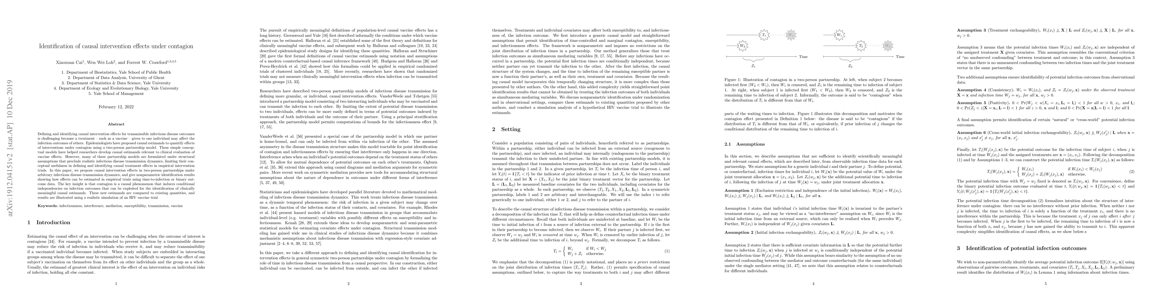 Defining and identifying causal intervention effects for transmissible infectious disease outcomes is challenging because a treatment -- such as a vaccine -- given to one individual may affect the infection outcomes of others. Epidemiologists have proposed causal estimands to quantify effects of interventions under contagion using a two-person partnership model. These simple conceptual models have helped researchers develop causal estimands relevant to clinical evaluation of vaccine effects. However, many of these partnership models are formulated under structural assumptions that preclude realistic infectious disease transmission dynamics, limiting their conceptual usefulness in defining and identifying causal treatment effects in empirical intervention trials. In this paper, we propose causal intervention effects in two-person partnerships under arbitrary infectious disease transmission dynamics, and give nonparametric identification results showing how effects can be estimated in empirical trials using time-to-infection or binary outcome data. The key insight is that contagion is a causal phenomenon that induces conditional independencies on infection outcomes that can be exploited for the identification of clinically meaningful causal estimands. These new estimands are compared to existing quantities, and results are illustrated using a realistic simulation of an HIV vaccine trial.