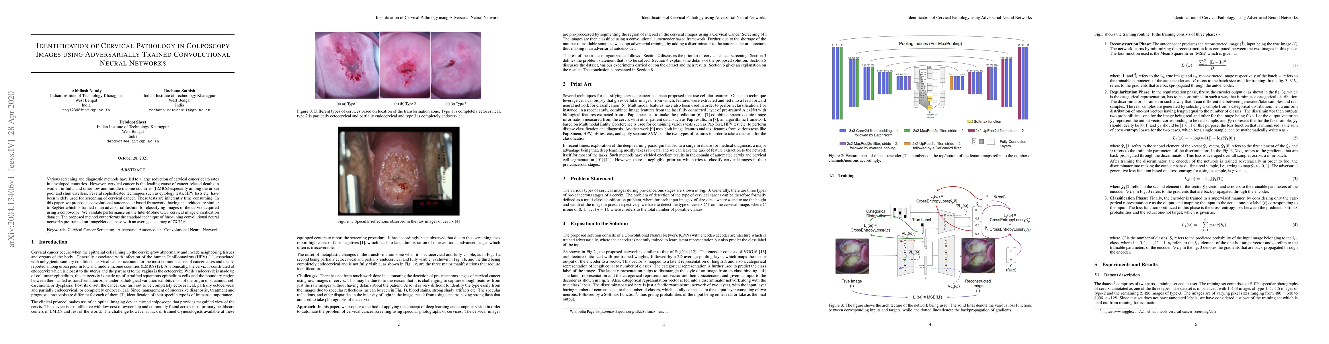 This paper proposes a convolutional autoencoder framework trained adversarially to classify cervical images from colposcopes, outperforming standard CNN techniques with an accuracy of 73.75%. The method aims to improve cervical cancer screening efficiency, especially in low and middle-income countries.