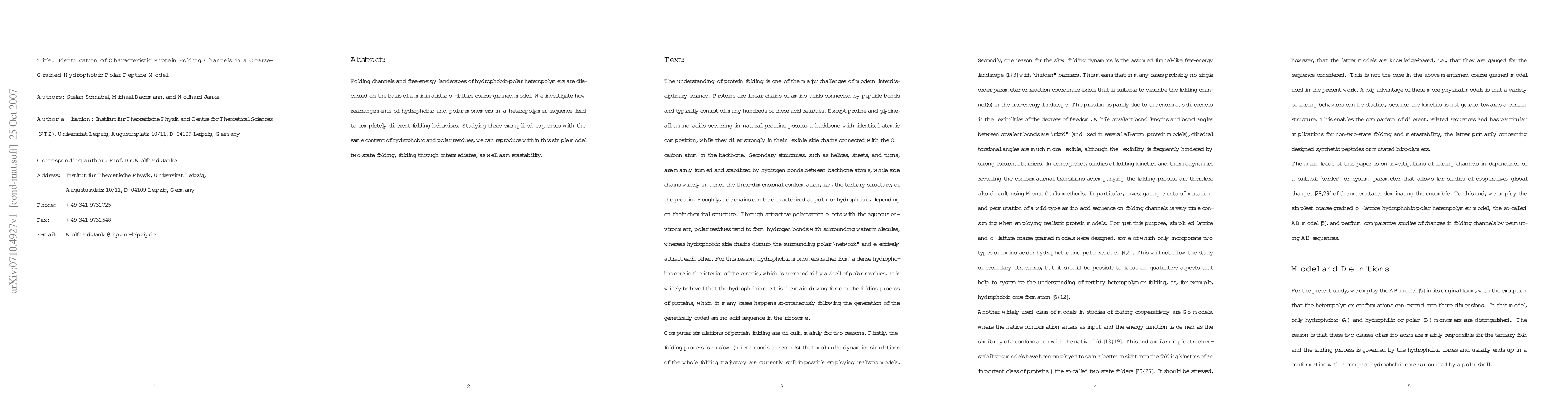 This paper identifies characteristic protein folding channels in a coarse-grained hydrophobic-polar peptide model, demonstrating how different arrangements of hydrophobic and polar monomers lead to varied folding behaviors, including two-state folding, intermediate folding, and metastability.