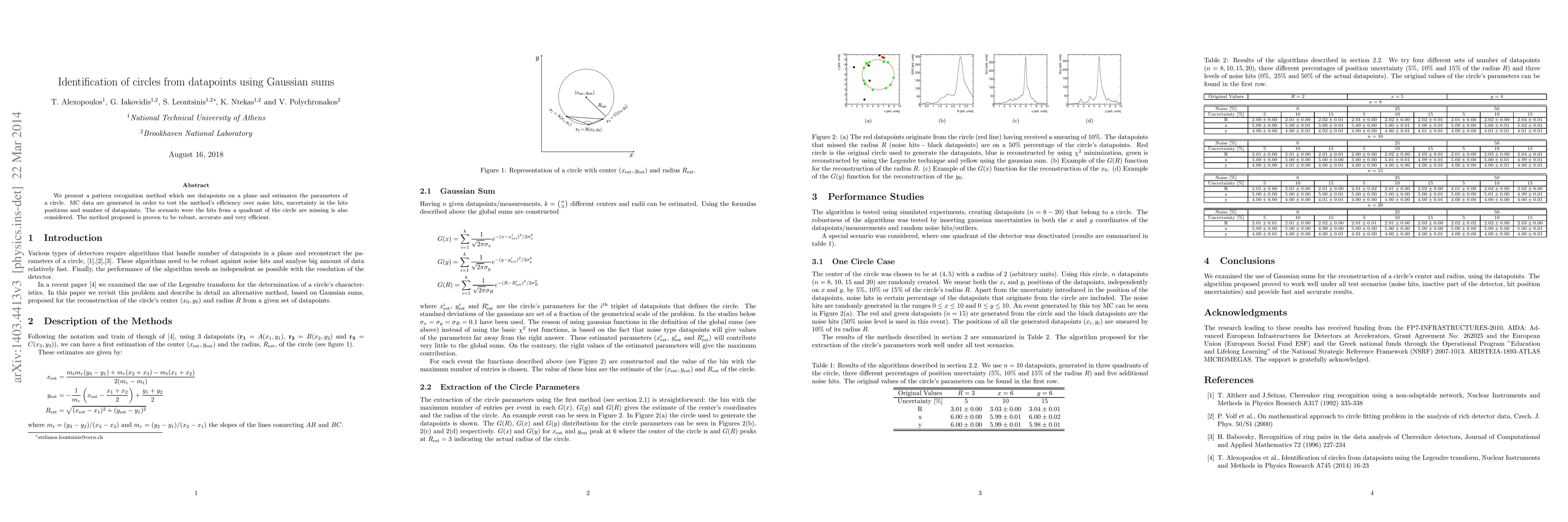 A new method identifies circles from data points using Gaussian sums, proving robustness and accuracy in various scenarios with noise and missing hits.