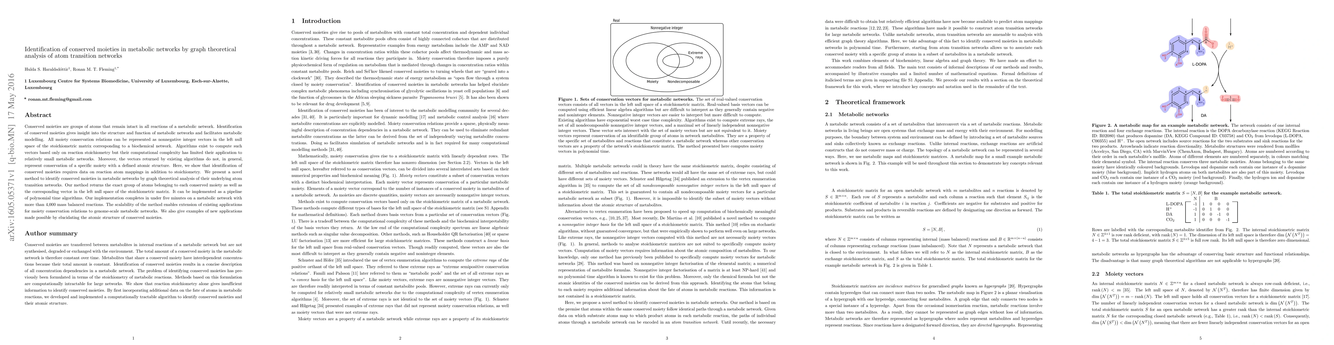 This paper introduces a novel method for identifying conserved moieties in metabolic networks using graph theoretical analysis of atom transition networks, providing exact atomic structures and improving scalability for genome-scale applications. The method efficiently computes conserved moiety vectors in polynomial time, enabling broader use in metabolic modelling.