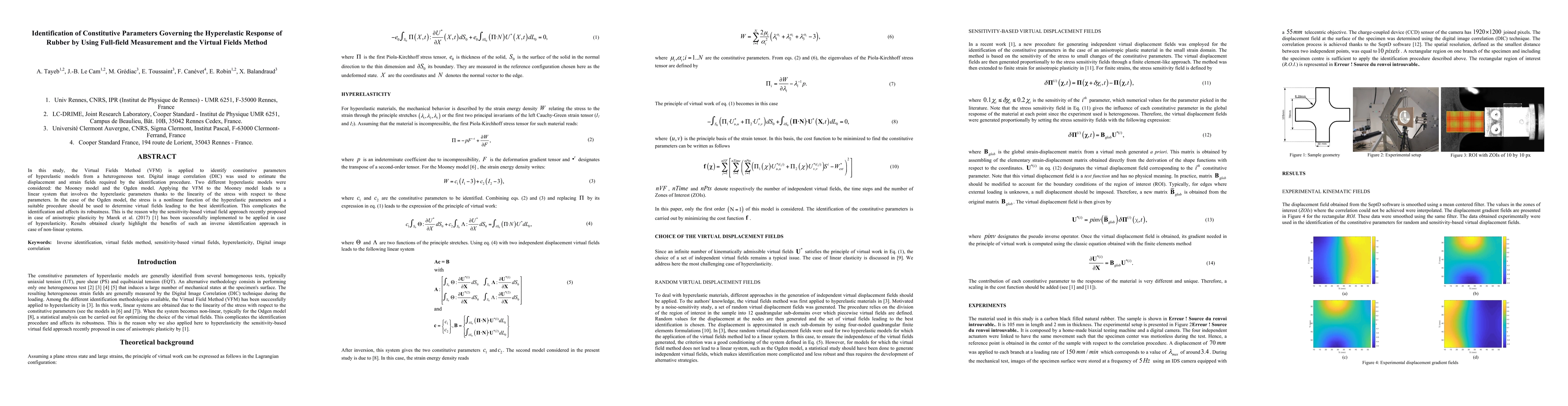 This paper uses the Virtual Fields Method (VFM) and digital image correlation to identify constitutive parameters for hyperelastic rubber models, specifically the Mooney and Ogden models. While the VFM is straightforward for the linear Mooney model, it requires a sensitivity-based approach for the nonlinear Ogden model, demonstrating the method's effectiveness in handling nonlinear systems.