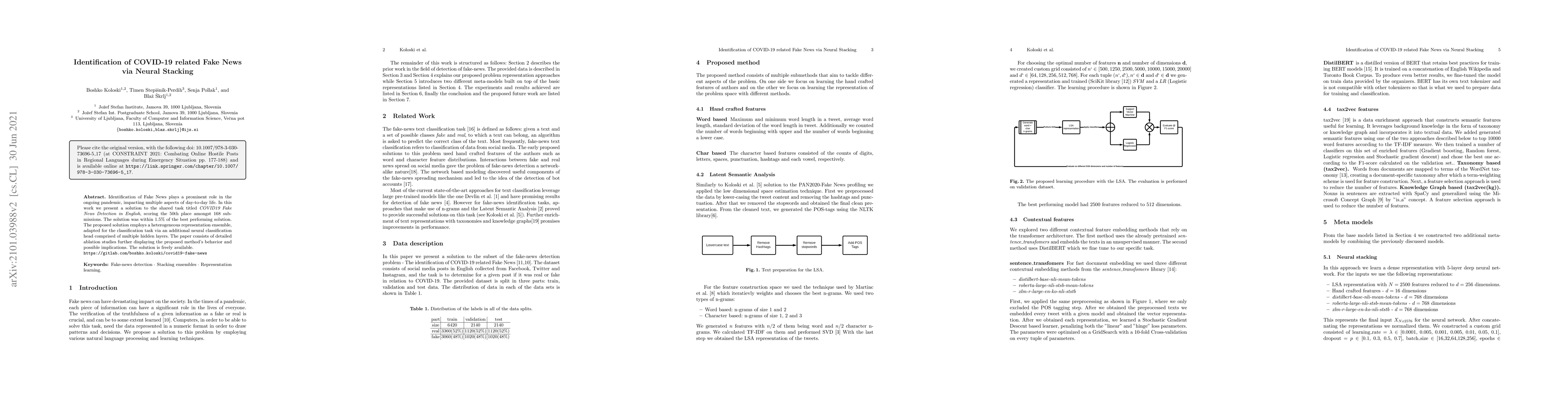 Identification of Fake News plays a prominent role in the ongoing pandemic, impacting multiple aspects of day-to-day life. In this work we present a solution to the shared task titled COVID19 Fake News Detection in English, scoring the 50th place amongst 168 submissions. The solution was within 1.5% of the best performing solution. The proposed solution employs a heterogeneous representation ensemble, adapted for the classification task via an additional neural classification head comprised of multiple hidden layers. The paper consists of detailed ablation studies further displaying the proposed method's behavior and possible implications. The solution is freely available. \url{https://gitlab.com/boshko.koloski/covid19-fake-news}