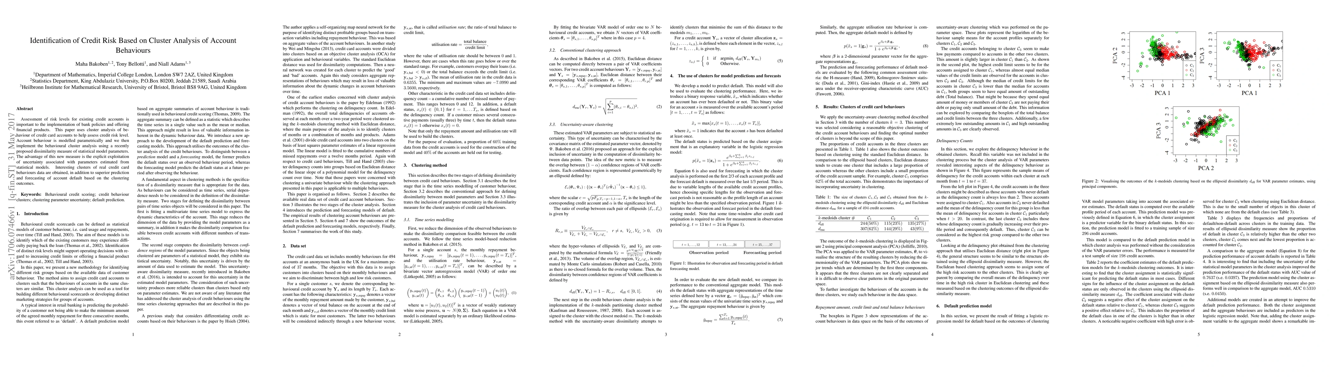 Assessment of risk levels for existing credit accounts is important to the implementation of bank policies and offering financial products. This paper uses cluster analysis of behaviour of credit card accounts to help assess credit risk level. Account behaviour is modelled parametrically and we then implement the behavioural cluster analysis using a recently proposed dissimilarity measure of statistical model parameters. The advantage of this new measure is the explicit exploitation of uncertainty associated with parameters estimated from statistical models. Interesting clusters of real credit card behaviours data are obtained, in addition to superior prediction and forecasting of account default based on the clustering outcomes.