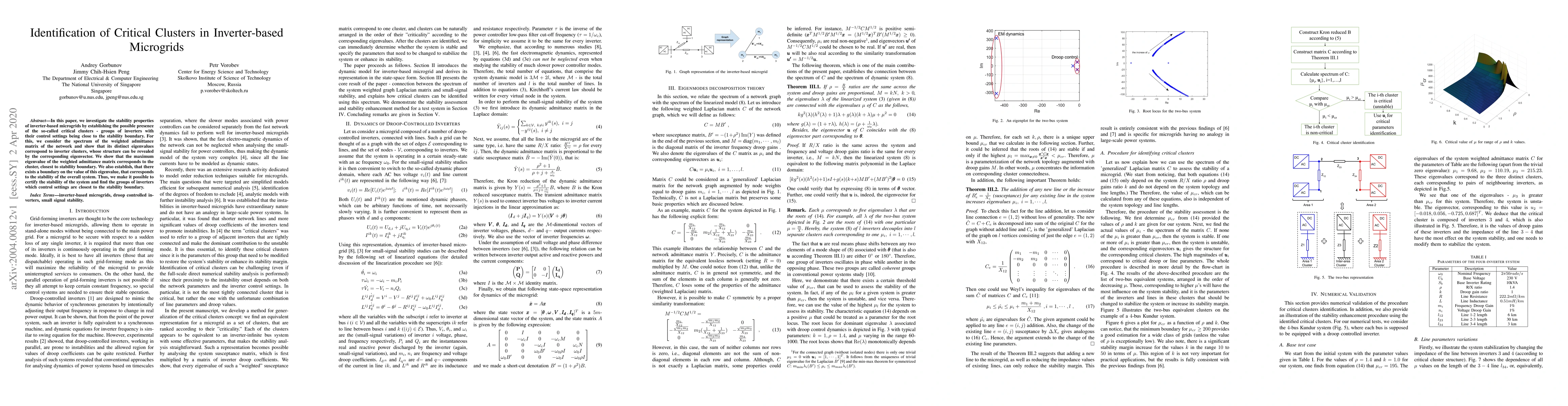 In this paper, we investigate the stability properties of inverter-based microgrids by establishing the possible presence of the so-called critical clusters - groups of inverters with their control settings being close to the stability boundary. For this, we consider the spectrum of the weighted admittance matrix of the network and show that its distinct eigenvalues correspond to inverter clusters, whose structure can be revealed by the corresponding eigenvector. We show that the maximum eigenvalue of the weighted admittance matrix corresponds to the cluster, closest to stability boundary. We also establish, that there exists a boundary on the value of this eigenvalue, that corresponds to the stability of the overall system. Thus, we make it possible to certify the stability of the system and find the groups of inverters in which control settings are closest to the stability boundary.