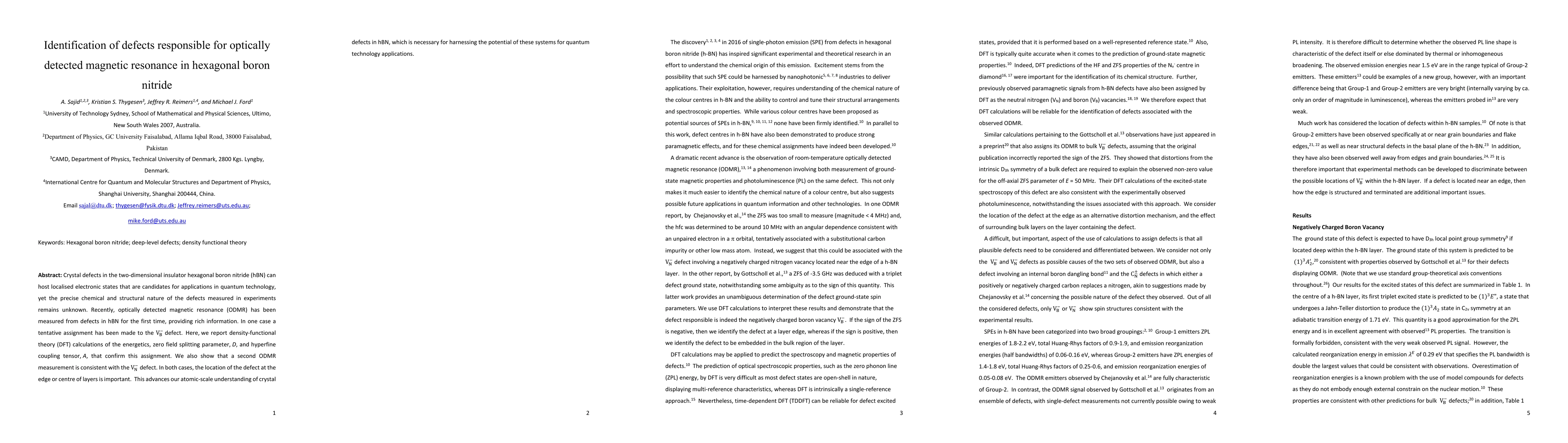 This paper uses density-functional theory calculations to identify specific crystal defects in hexagonal boron nitride (hBN) responsible for optically detected magnetic resonance (ODMR). The study confirms the VB- defect and identifies a second ODMR signal as the VN- defect, highlighting the importance of defect location for quantum technology applications.
