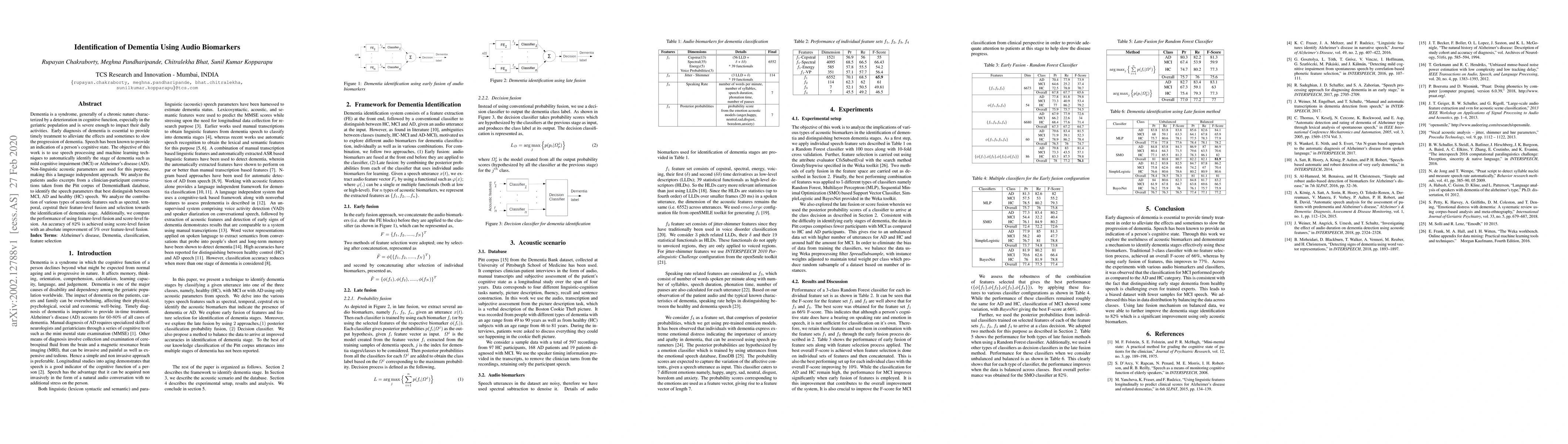 Dementia is a syndrome, generally of a chronic nature characterized by a deterioration in cognitive function, especially in the geriatric population and is severe enough to impact their daily activities. Early diagnosis of dementia is essential to provide timely treatment to alleviate the effects and sometimes to slow the progression of dementia. Speech has been known to provide an indication of a person's cognitive state. The objective of this work is to use speech processing and machine learning techniques to automatically identify the stage of dementia such as mild cognitive impairment (MCI) or Alzheimers disease (AD). Non-linguistic acoustic parameters are used for this purpose, making this a language independent approach. We analyze the patients audio excerpts from a clinician-participant conversations taken from the Pitt corpus of DementiaBank database, to identify the speech parameters that best distinguish between MCI, AD and healthy (HC) speech. We analyze the contribution of various types of acoustic features such as spectral, temporal, cepstral their feature-level fusion and selection towards the identification of dementia stage. Additionally, we compare the performance of using feature-level fusion and score-level fusion. An accuracy of 82% is achieved using score-level fusion with an absolute improvement of 5% over feature-level fusion.