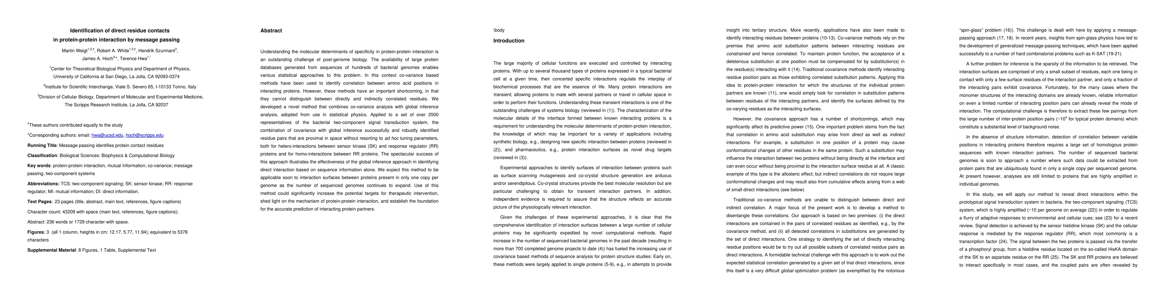 This paper presents a novel method combining covariance analysis with global inference to identify direct residue contacts in protein-protein interactions, overcoming the limitation of previous methods that could only distinguish correlated but not directly interacting residues. The approach successfully identified direct interactions in bacterial two-component signal transduction systems, suggesting its potential for broader applications in therapeutic target identification and understanding protein interaction mechanisms.
